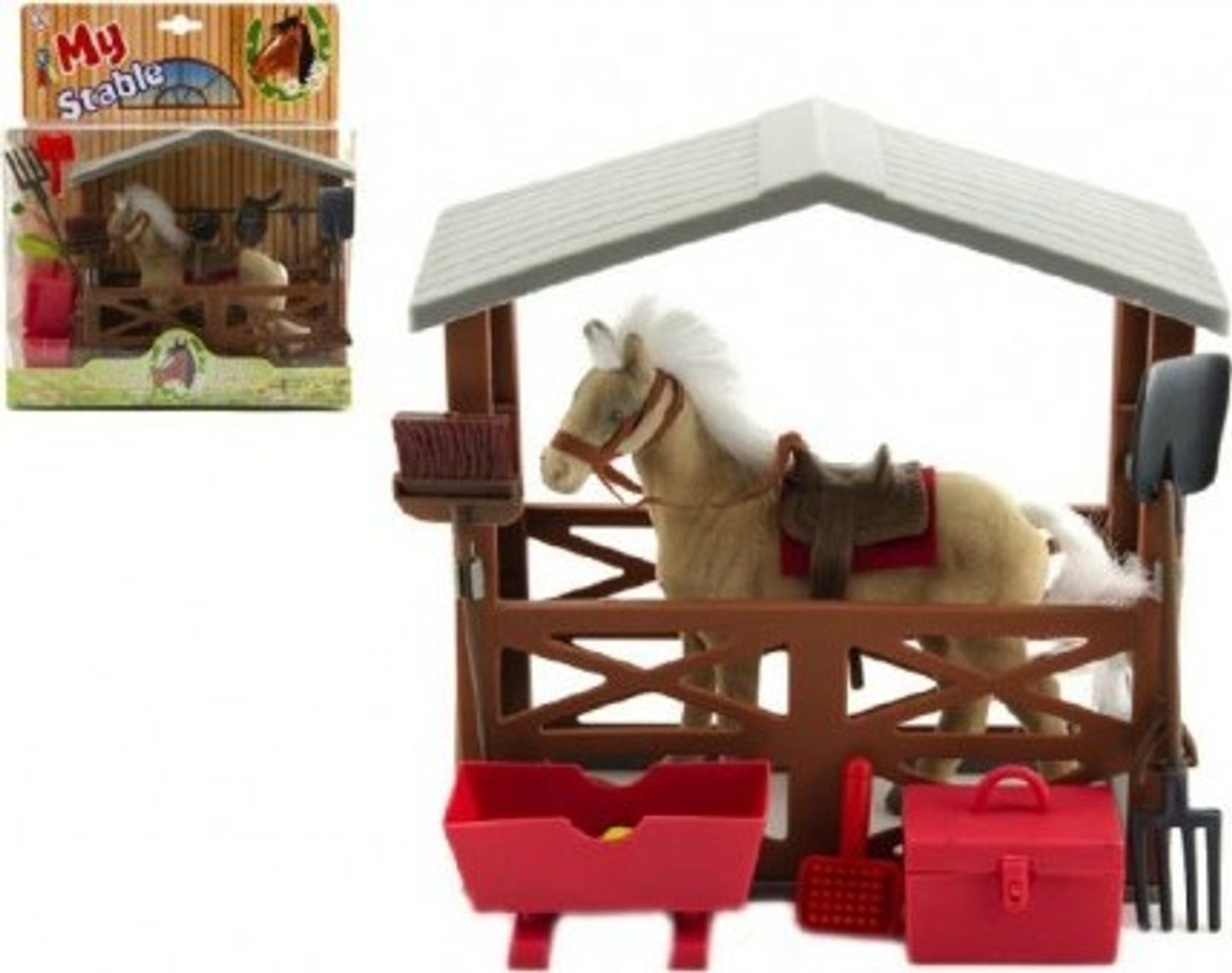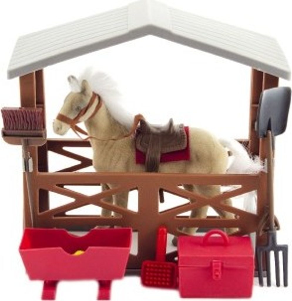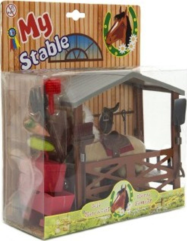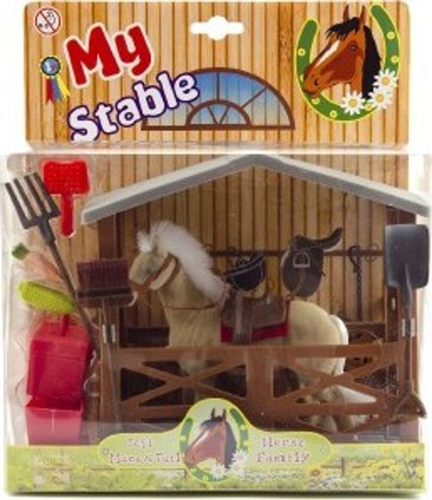 Kůň se sedlem a ohlávkou pro všechny obdivovatele a milovníky koní. Kůň je plastový s povrchovou úpravou fliška. Balení obsahuje také stáj a doplňky jako vědro na vodu, koště, vidle, lopatu a kufřík s potřebami pro koně.