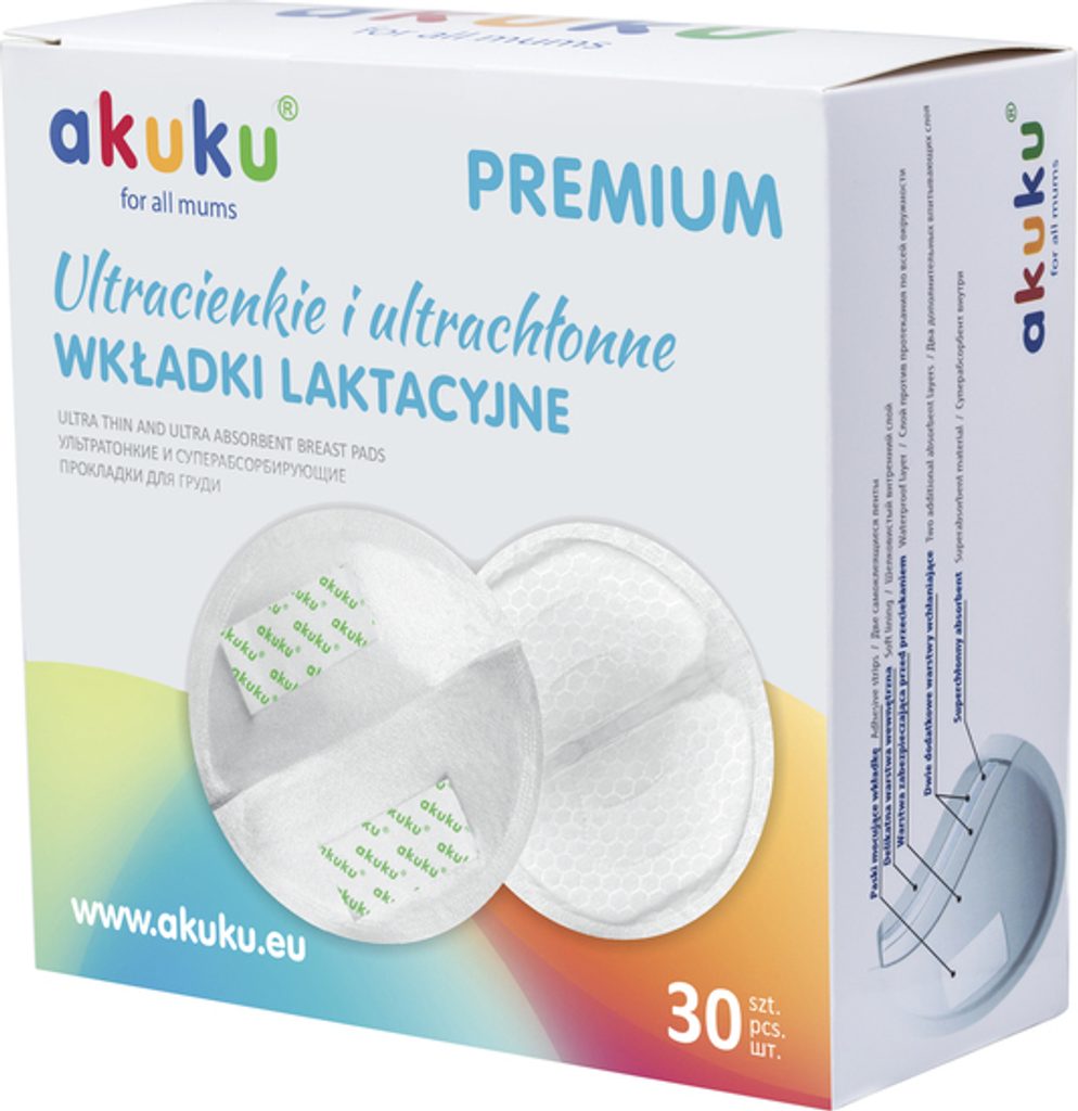 Ultratenké, ultraabsorpční prsní vložky "akuku", pohodlné a diskrétní, tvarované. Absorpce stélky je dána superabsorbentem a dvěma dalšími absorpčními vrstvami. Unikátní technologie umožnila vytvoření extrémně tenkých vložek o tloušťce pouze 1 mm, které poskytují pocit sucha a svěžesti po dlouhou dobu. Ultratenké vložky mají gelovou vložku, která odvádí vlhkost od spodního prádla. Vzdušná struktura stélky je příjemná k tělu. Samolepicí proužky drží vložku na místě. Každá vložka je zabalena v samostatném fóliovém sáčku, který zajišťuje odpovídající úroveň hygieny a pohodlí doma i venku.