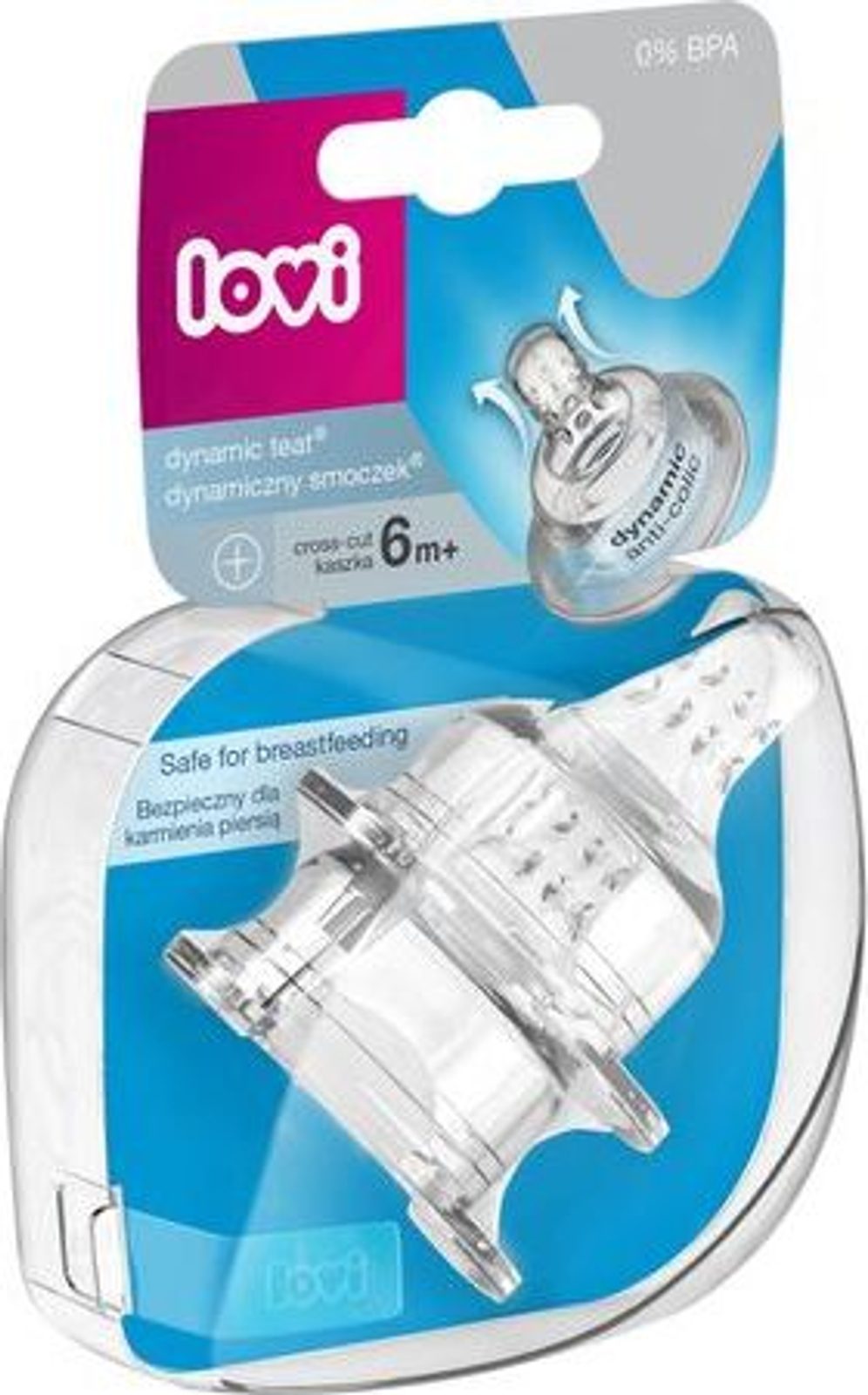Dynamická savička LOVI pro krmení odsátým mateřským mlékem vznikla jako výsledek výzkumu za účasti lékařů a neurologedů. Je vyroben z heterogenních silikonových vrstev. Měkká, prodlužující se špička mobilizuje svaly dutiny ústní k aktivní a namáhavé práci během krmení. Tvrdá, široká, profilovaná základna poskytuje rtům stabilní oporu. Vsuvka má antikolikový systém. Podávání mateřského mléka dynamickou bradavkou LOVI je bezpečné pro kojení (nejlepší forma kojenecké výživy), nenarušuje sací reflex - potvrzeno v průzkumu na základě odborného průzkumu pod lékařským dohledem provedeného v roce 2007 ambulantně na skupině 607 kojenců za účasti lékařů, porodních asistentek a rodičů. Sada obsahuje: 2 vsuvky zvoleného průtoku