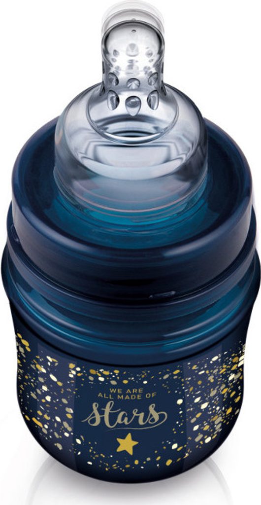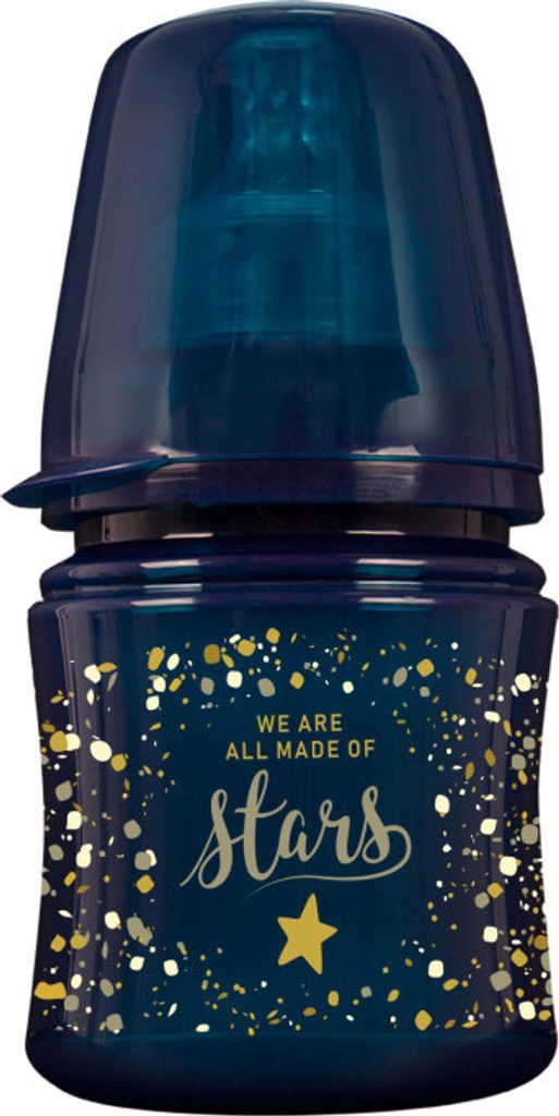 Stardust je tady! Jedinečná, designově nepřehlédnutelná, prémiová kolekce od LOVI. Kolekce se pyšní lehkou lahví o objemu 120 ml s dynamickou silikonovou savičkou LOVI, která povzbuzuje miminko k aktivní činnosti během sání, stejně jako u kojení a nenarušuje tak jeho sací reflex. Lahev neobsahuje BPA. Unikátní design kolekce Stardust - zdobení v podobě zlatého třpytu, který připomíná hvězdné nebe.