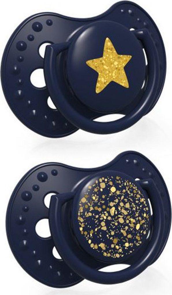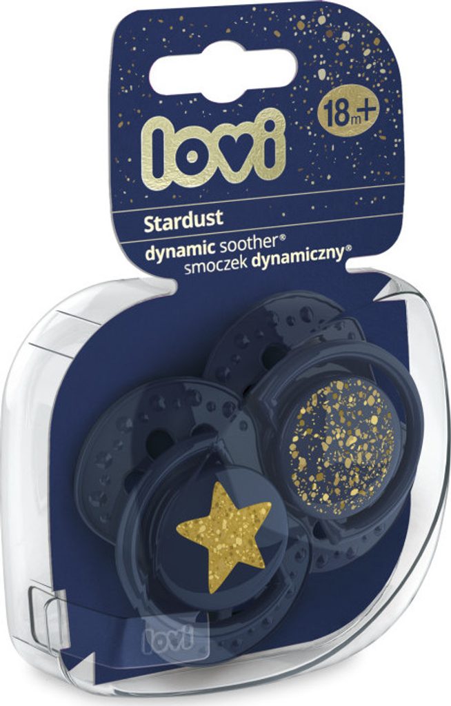 Stardust je tady! Jedinečná, designově nepřehlédnutelná, prémiová kolekce od LOVI. Unikátní design kolekce Stardust - zdobení v podobě zlatého třpytu, který připomíná hvězdné nebe. Kolekce se pyšní dynamickým dudlíkem LOVI ve velikosti 18m+, který byl vytvořen ve spolupráci s neurologopedy s cílem zajistit přirozený a zdravý vývoj zubního patra, zubů a dásní starších dětí. Gumička dudlíku se dynamicky přizpůsobuje sání dítěte, nenarušuje sací reflex. Neobsahuje BPA. V balení 2 ks.