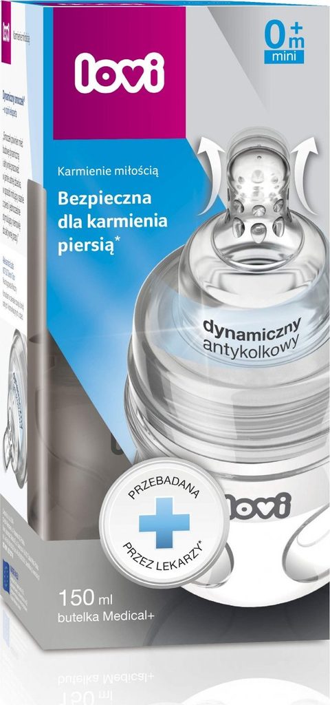 Obsahuje dynamický silikonový dudlík Lovi, který při krmení modifikuje svůj tvar (prodlužuje se). Povzbuzuje dítě k aktivní činnosti během sání, stejně jako u kojení, stimuluje místa, která se podílí na rozvoji mluvy a pozitivně ovlivňuje správný vývoj celé dutiny ústní. Speciálně profilovaný tvar láhve umožňuje správný způsob držení.