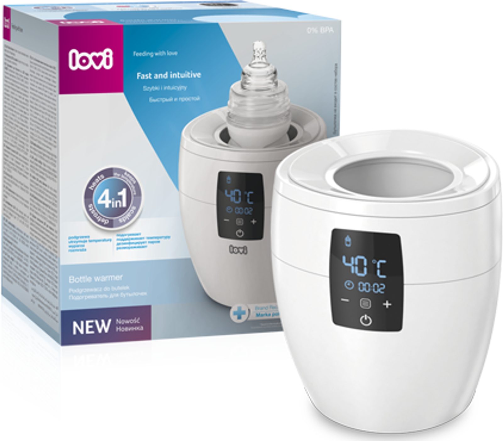 Ohřívač lahví LOVI 4 v 1 - ohřívá, udržuje teplotu, rozmrazuje a sterilizuje párou. Rychlé a rovnoměrné ohřátí. Intuitivní ovládání na přehledné obrazovce. 4 funkce ve třech módech. BOTTLE, HOT, DINNER . Univerzální - kompatibilní s většinou kojeneckých lahví dostupných na trhu. Bezpečný – automatické vypnutí při absenci vody v režimu HOT. V balení odměrka na vodu.