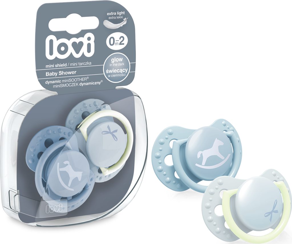 LOVI 0-2 m Dynamický dudlík Baby Shower Boy je určen pro nejmenší miminka (od narození do 2 měsíců věku) a má proto menší a lehčí štít než standardní šidítka LOVI. Dynamická bradavka Baby Shower Boy 0-2 m je pro novorozence bezpečná, protože nenarušuje sací reflex, řeč a vývoj skusu.