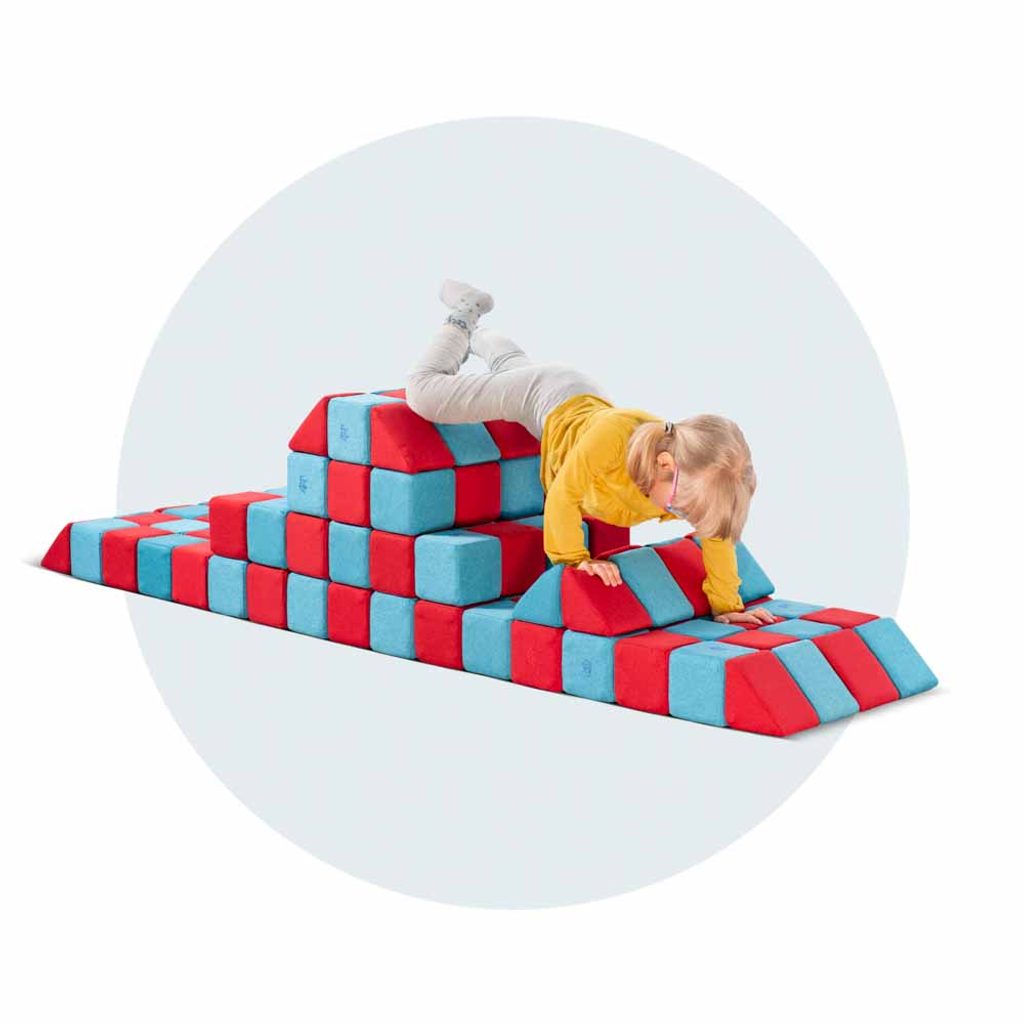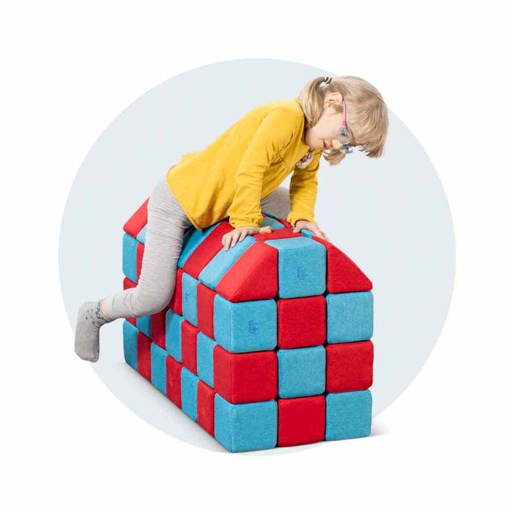 Díky nim se kostky snadno spojují a děti mohou vytvářet neomezené množství tvarů – od jednoduchých věží až po domečky, hrady, prolézačky či sedací nábytek.