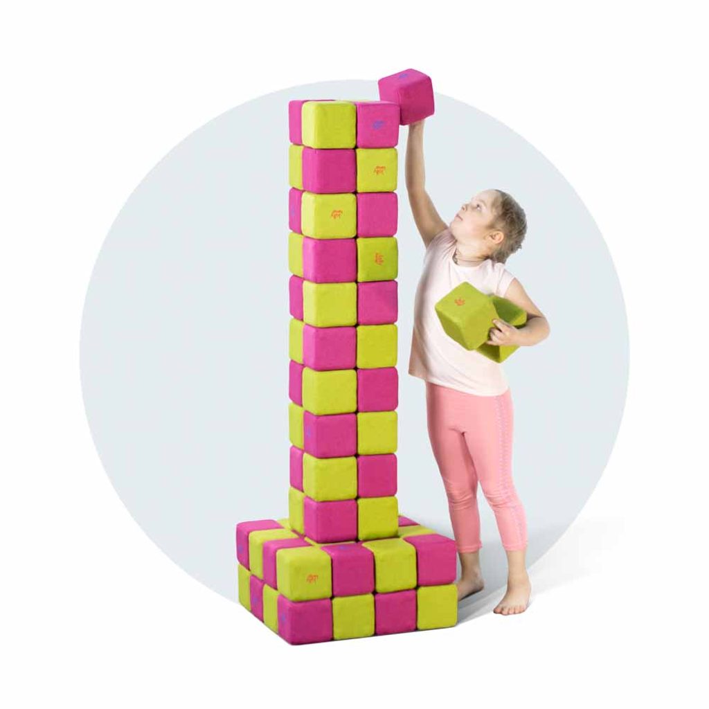 Díky nim se kostky snadno spojují a děti mohou vytvářet neomezené množství tvarů – od jednoduchých věží až po domečky, hrady, prolézačky či sedací nábytek.