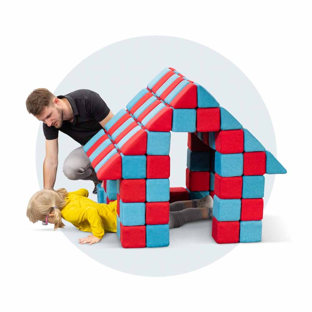 Díky nim se kostky snadno spojují a děti mohou vytvářet neomezené množství tvarů – od jednoduchých věží až po domečky, hrady, prolézačky či sedací nábytek.