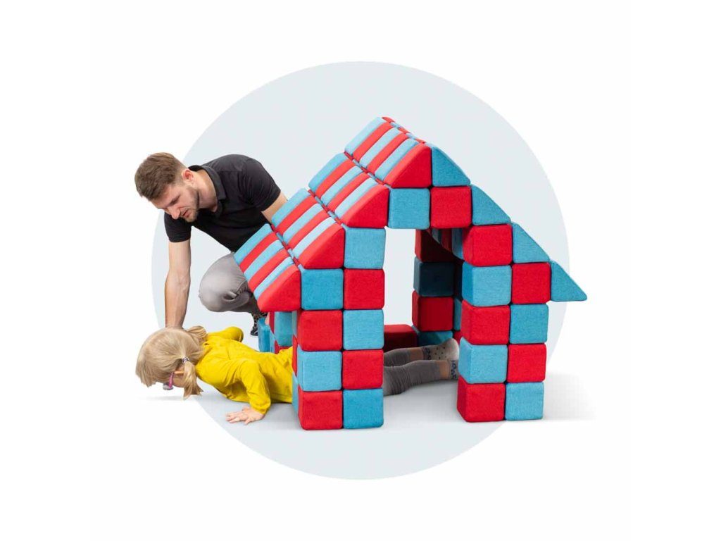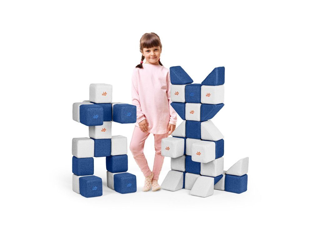 Díky nim se kostky snadno spojují a děti mohou vytvářet neomezené množství tvarů – od jednoduchých věží až po domečky, hrady, prolézačky či sedací nábytek.