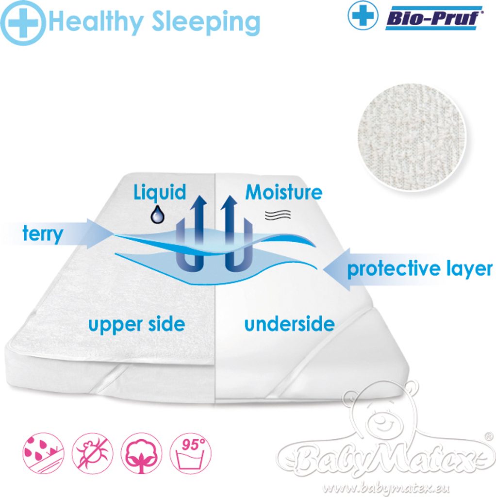 Matracový chránič Baby Matex Stabile 120x60 cm - vrchní vrstva chrániče je vyrobena z froté a spodní vrstva je vyrobena z PVC, které zabraňuje prosáknutí.