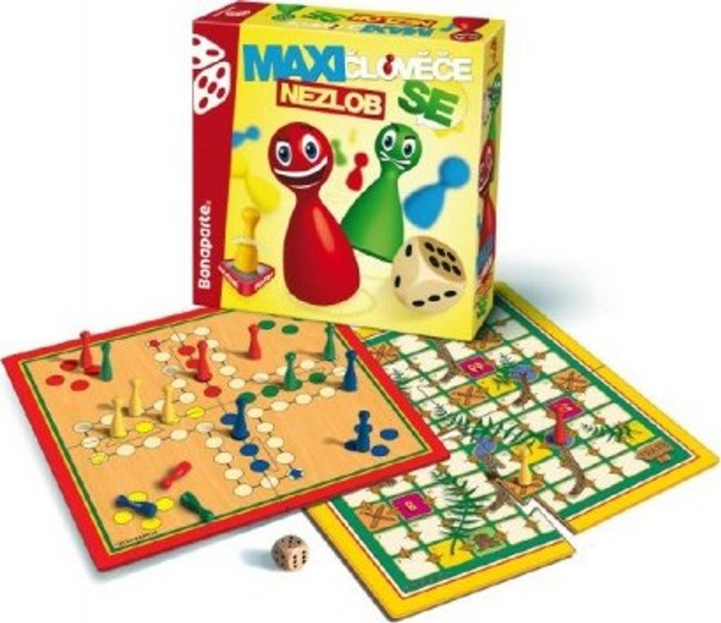 Člověče nezlob se a Lesní závod. Dvě hry v extra velkém provedení, dřevné figurky výška 5 cm, velká dřevěná kostka. Figurky se výborně drží jak těm nejmenším dětem, tak seniorům.