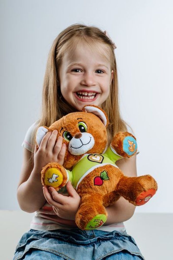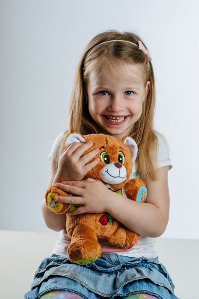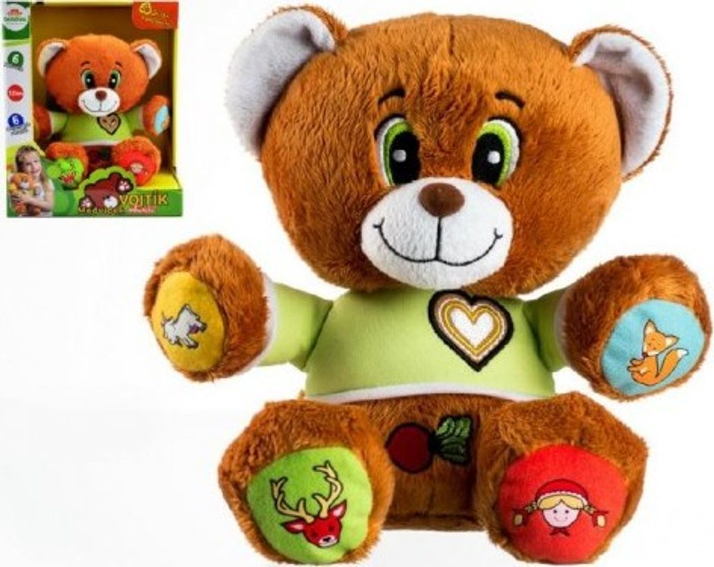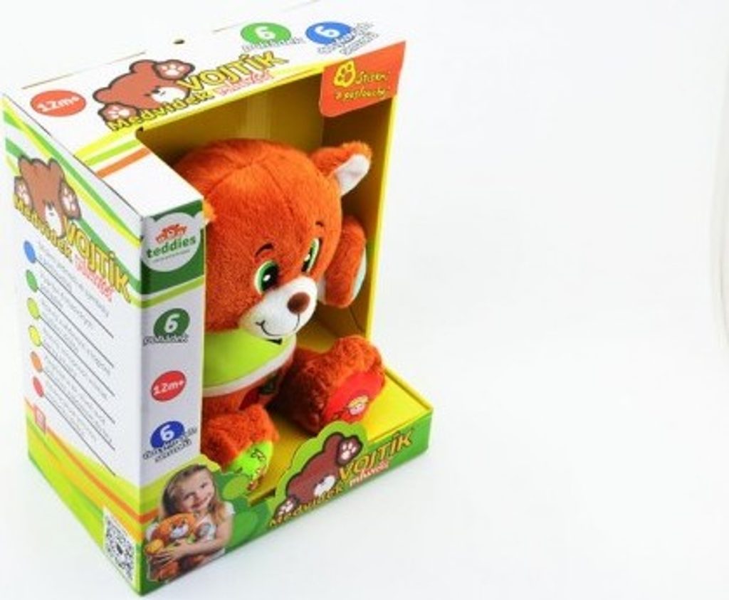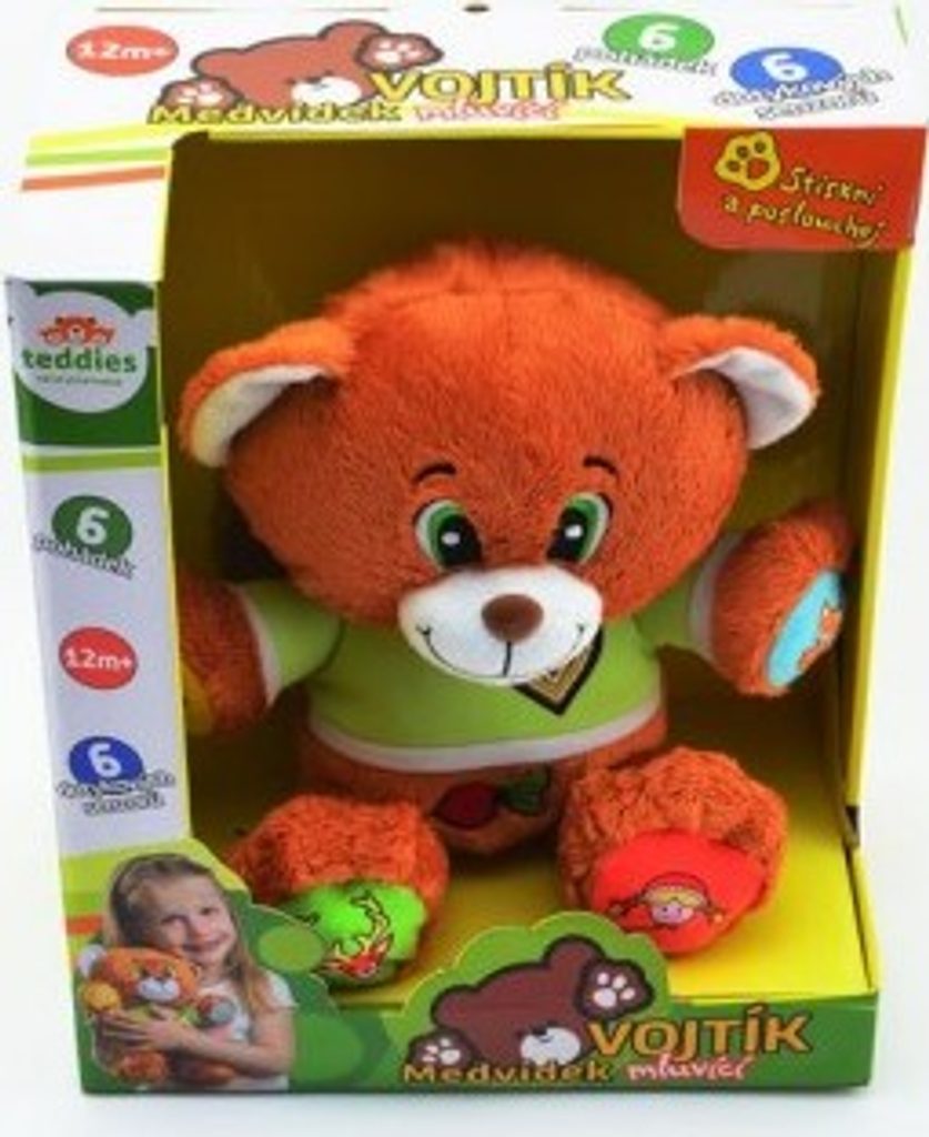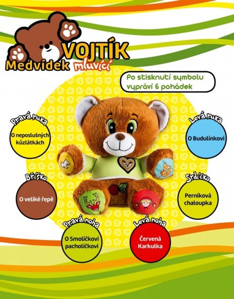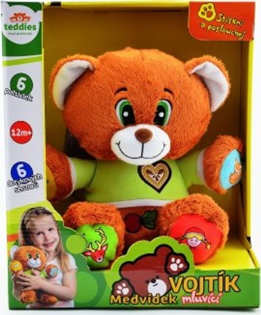 Veselý medvídek Vojtík vypráví dětem šest známých, českých pohádek - O neposlušných kůzlátkách, O veliké řepě, O Smolíčkovi pacholíčkovi, Červená Karkulka, Perníková Chaloupka, O Budulínkovi. Stačí zmáčknout symbol a poslouchat. Velikost medvídka 30 cm.