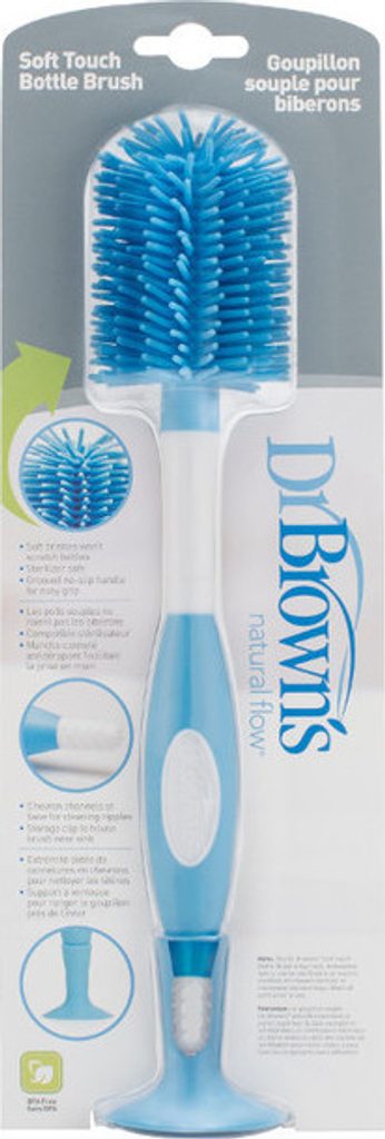 Kartáček na čištění lahví Dr. Browna s měkkými silikonovými štětinami, které zajistí 100% čištění lahví a nádob bez škrábanců a oděrek. Byl navržen pro všechny lahvičky Dr. Browna. Díky němu efektivně odstraníte veškeré nečistoty. Správně profilovaný hrot se dostane do těžko dostupných míst a pohodlná protiskluzová rukojeť zajišťuje stabilní úchop. Má žebrovaný hrot na čištění bradavek. Kartáč je dodáván s přísavkou pro pohodlné uložení ve svislé poloze. Vyrobeno z odolných a bezpečných materiálů, které neobsahují Bisfenol A. Lze mýt v myčce na horní polici. Dodává se v modré barvě.