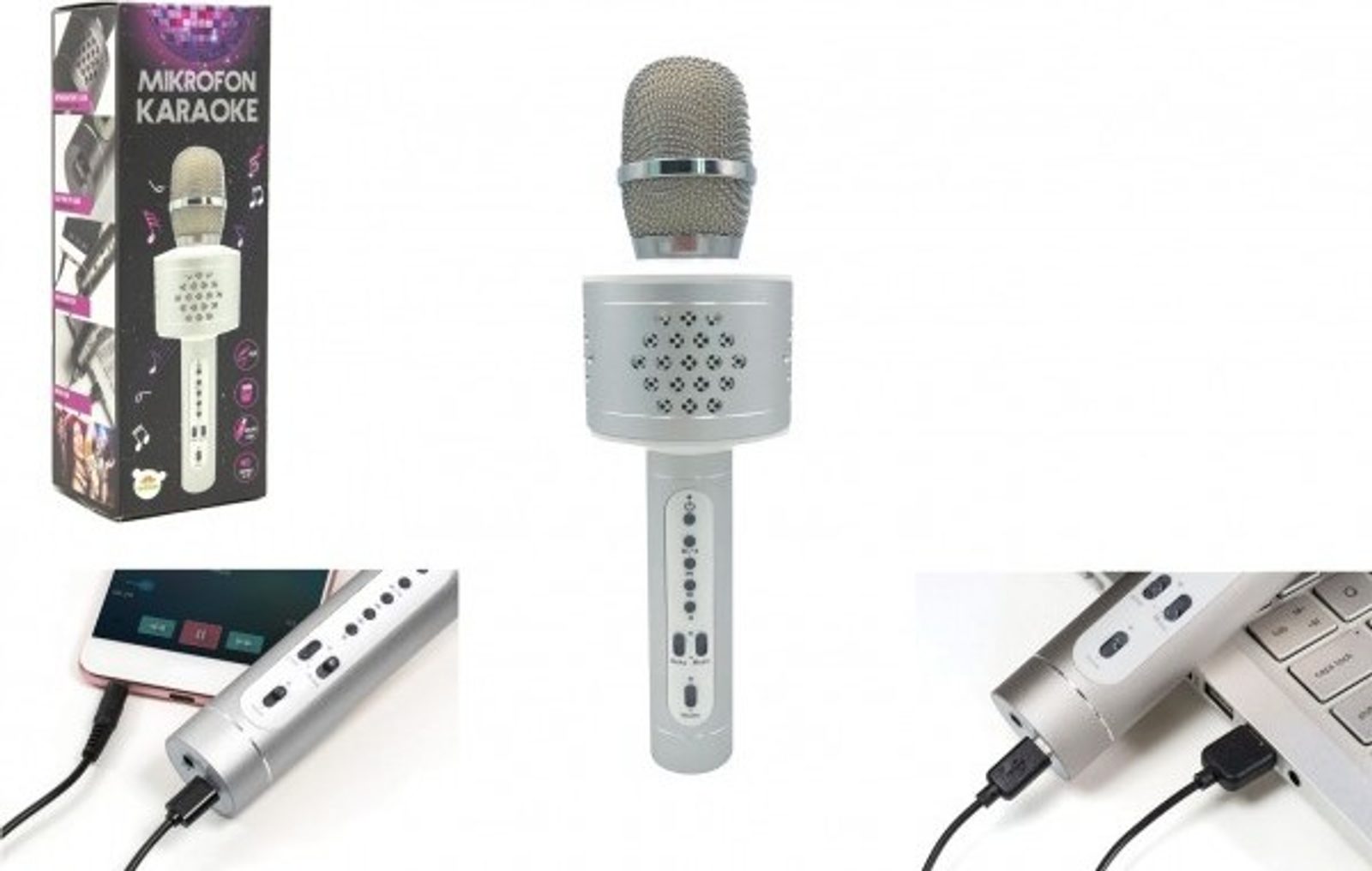 Obsah balení: karaoke mikrofon, nabíjecí kabel USB do Micro USB, audiokabel, návod k obsluze. Barva: stříbrná.