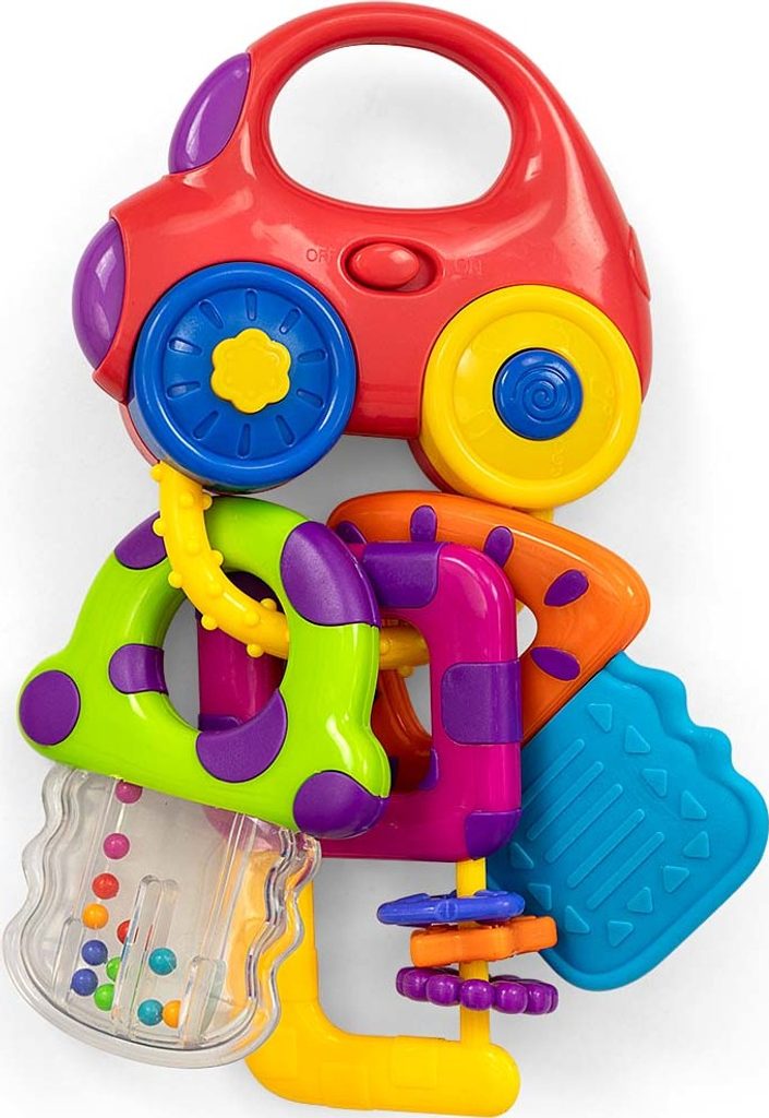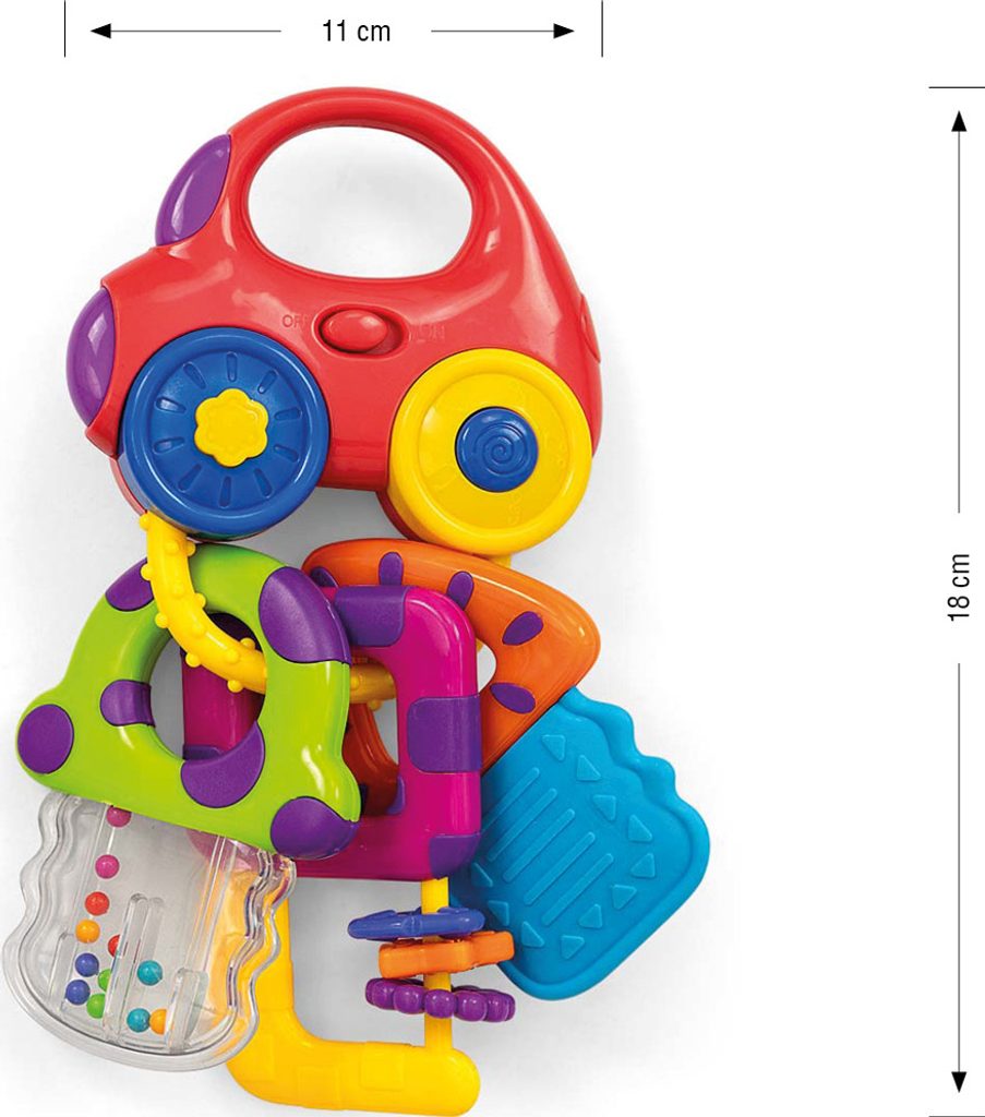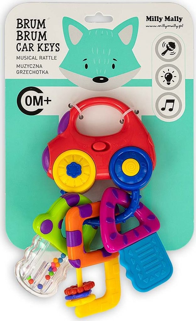 Hudební chrastítko od Milly Mally ve tvaru auta s přívěsky. Autíčko má madlo pro snadné uchopení, spínače světel a zvuku. Jsou k němu připevněny tři klíče od auta. Každý klíč má jiný tvar: první je průhledné chrastítko s kuličkami, druhý - klíč s pohyblivými barevnými disky, třetí je gumové kousátko s výstupky. Po stisknutí tlačítka na předním kole začne auto svítit a vydávat zvuky auta (alarm, klakson, zvuk jedoucího vozidla). Po stisknutí zadního tlačítka se rozsvítí a zahraje veselé melodie. Vypínač – světlo a zvuk startování motoru. CHARAKTERISTIKA: 2 tlačítka se světelnými a zvukovými efekty 2 chrastící klávesy 1 kousací klávesa 6 melodií Osvětlení přední části vozu Má vypínač "zapnuto/vypnuto" Baterie: 2 x LR44 (součástí výrobku) Připevněno na kartonový blistr. Věk: 0+ Má bezpečnostní certifikát TECHNICKÉ ÚDAJE: Délka: 18 cm Šířka: 10 cm Výška: 3 cm Hmotnost: 0,05 kg