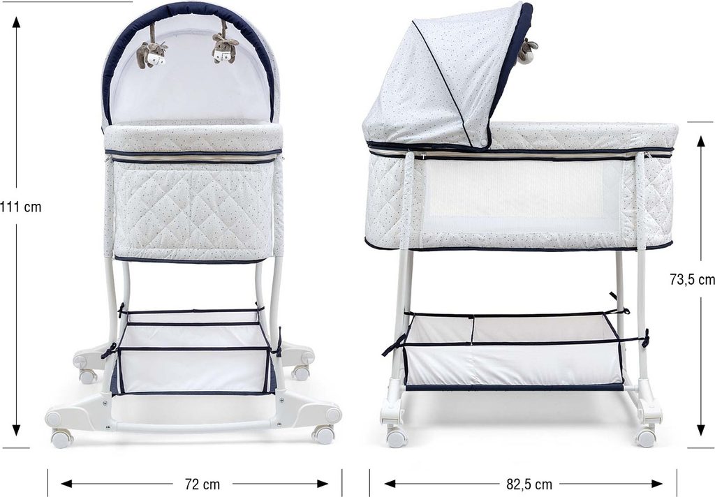 Celková délka: 82,5 cm Celková šířka: 72 cm Výška od podlahy se stříškou ve variantě postýlky: 111 cm Výška od podlahy se stříškou ve variantě kolébky: 107 cm Výška od podlahy k přenosné postýlce ve variantě kolébky: 73,5 cm Výška od podlahy k přenosné postýlce v kolébce: 69,5 cm Rozměry přenosné postýlky: 83 cm x 42,5 cm x 32 cm. Rozměry koše na příslušenství: 55 cm x 38 cm x 12 cm Hmotnost: 5,38 kg Matrace: Délka: 82 cm, Šířka: 40 cm,Tloušťka: 2,5 cm