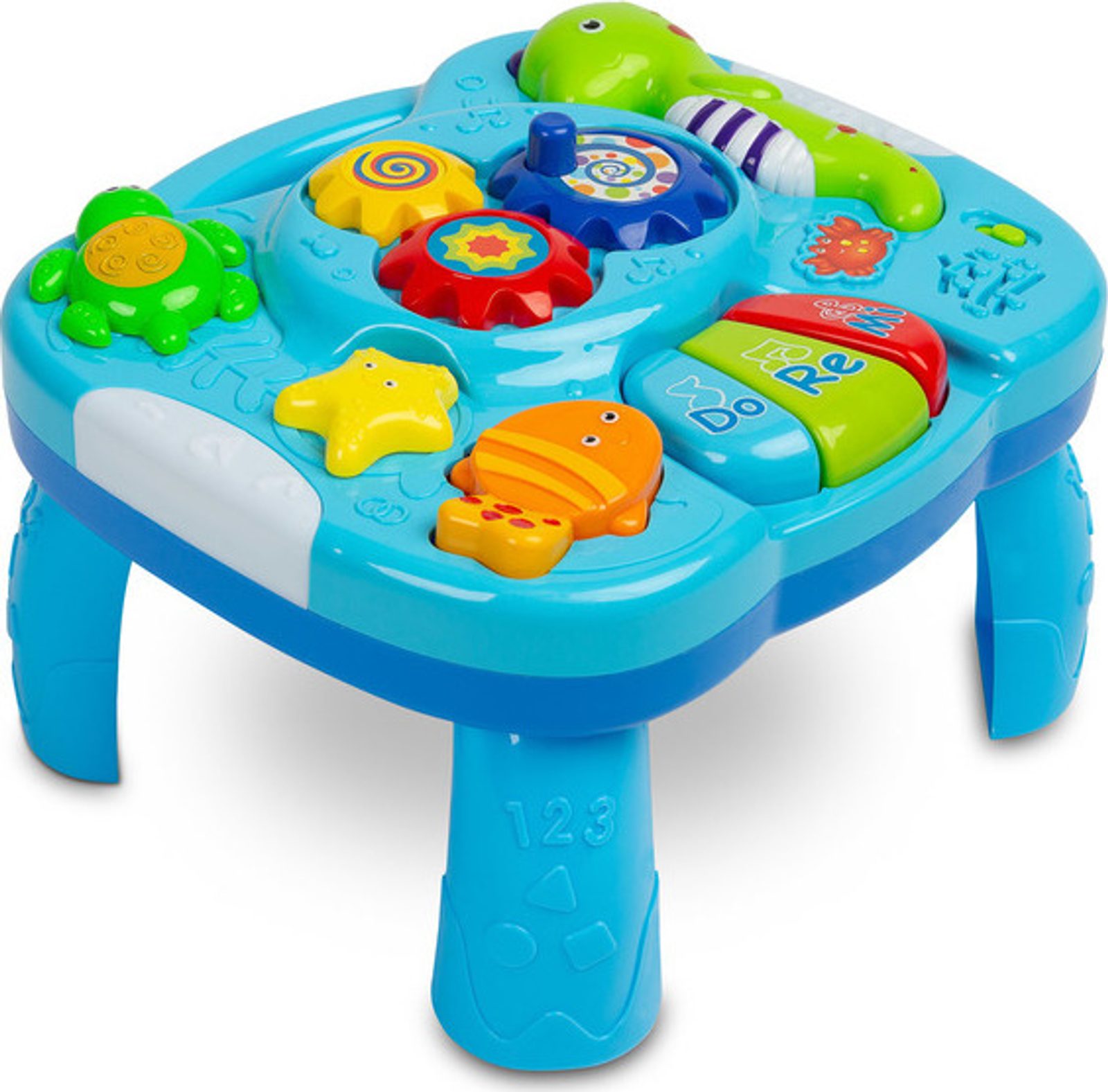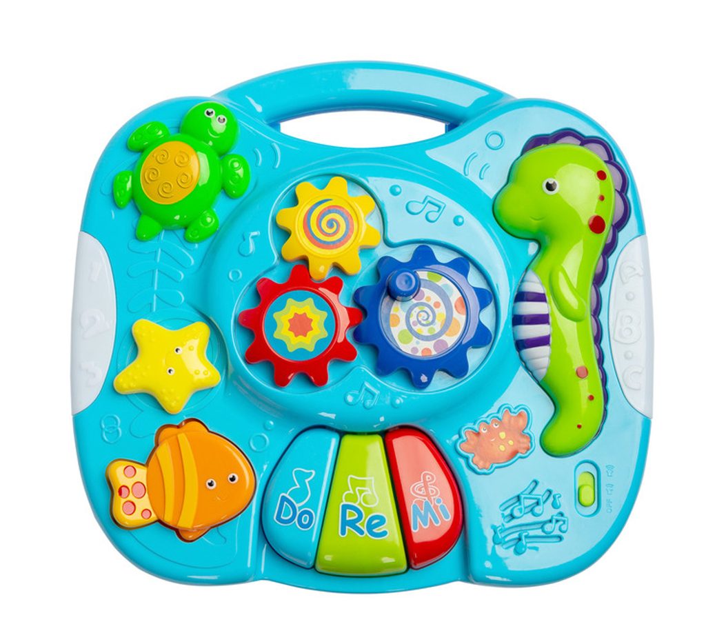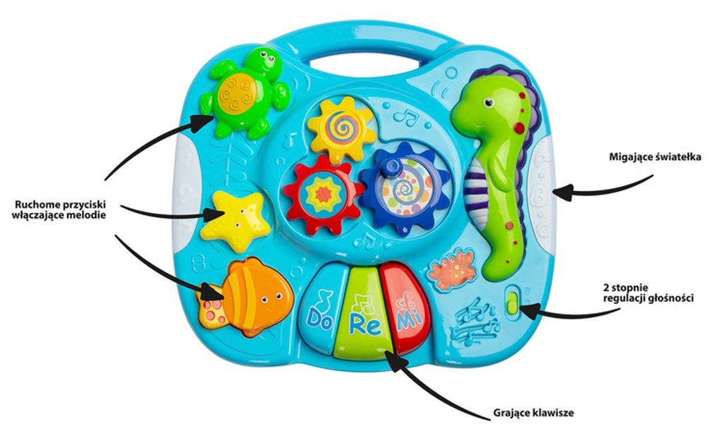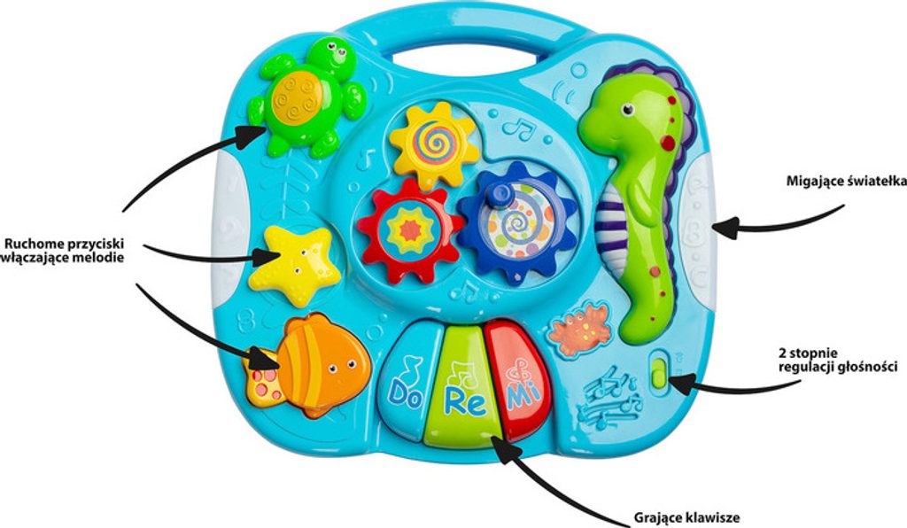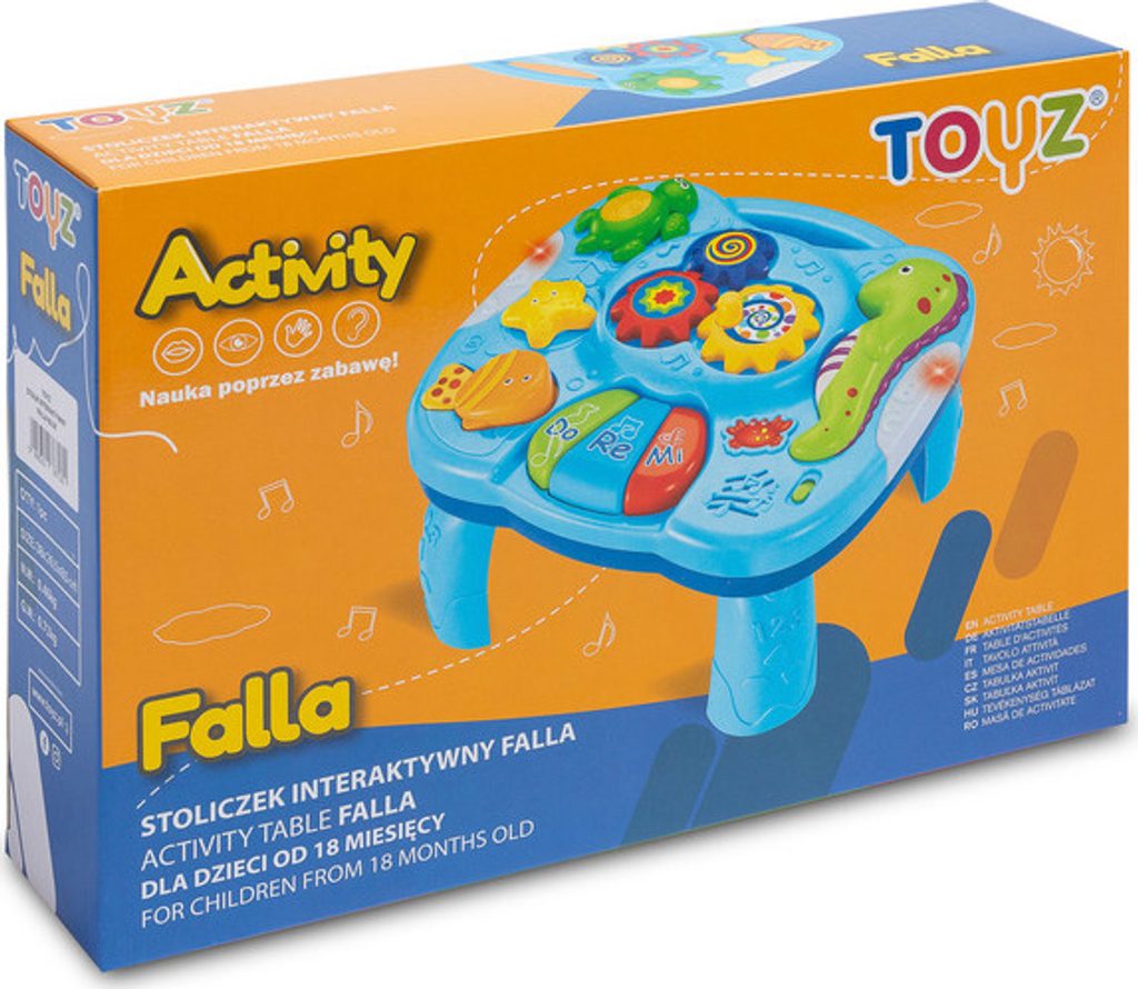 Interaktivní stolek Falla Toyz, který zajistí spoustu zábavy pro nejmenší. Deska stolu je vybavena mini pianem s klávesami DO RE MI, 3 tlačítky (každé funguje jinak), která zapínají různé melodie a knoflíkem s převody. Živé barvy přitahují pozornost a podporují zábavu. Stůl má 2-stupňovou regulaci hlasitosti. Falla umožňuje odepnout nožičky a díky speciálním popruhům připevnit na postýlku nebo připevnit na hrazdičku v kočárku.