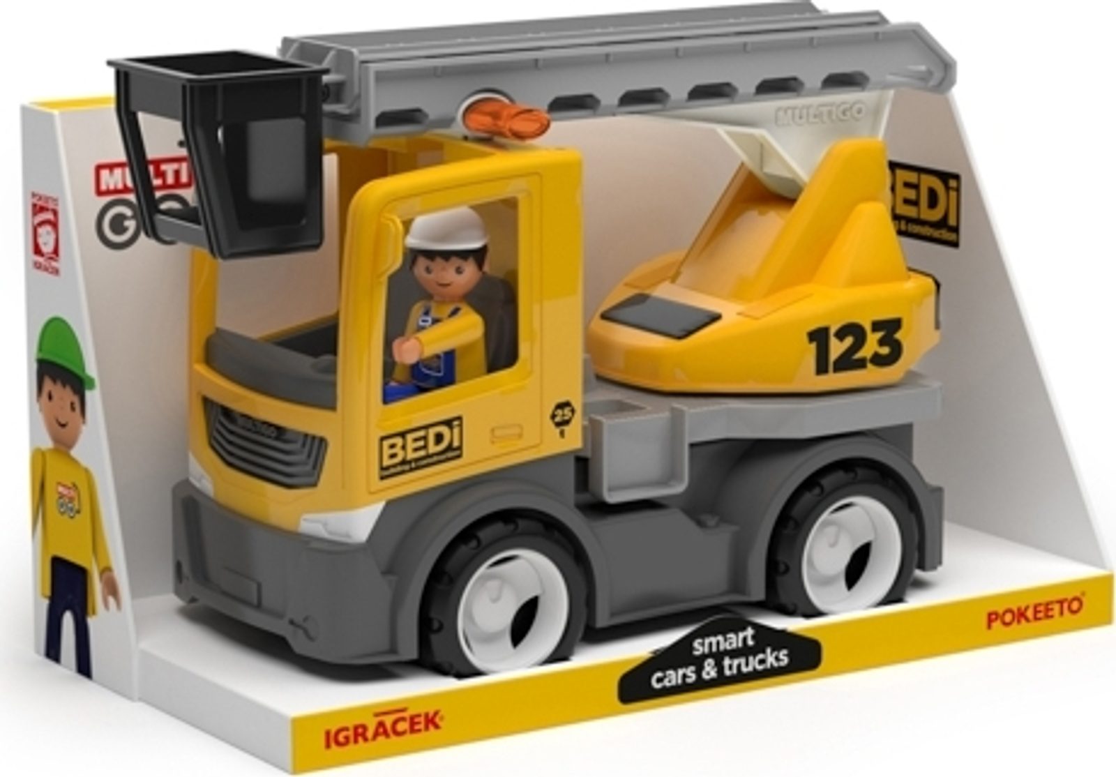 Technický popis: Žebříkový vozík je součástí řady Igracek MultiGo od EFKO Žebřík je otočný a výsuvný, umožňuje tři polohy aretace, stavěče lze umístit do žebříkového koše. Hračky lze libovolně kombinovat s dalším příslušenstvím MULTIGO a figurkami Igracek Vozidla MultiGo jsou vybavena systémem Bayonet, který umožňuje snadnou a rychlou výměnu přívěsů a dalšího příslušenství Vozidlo je zabaleno v estetické kartonové krabici, ideální jako dárek. Země původu: Česká republika, určeno pro děti 3+
