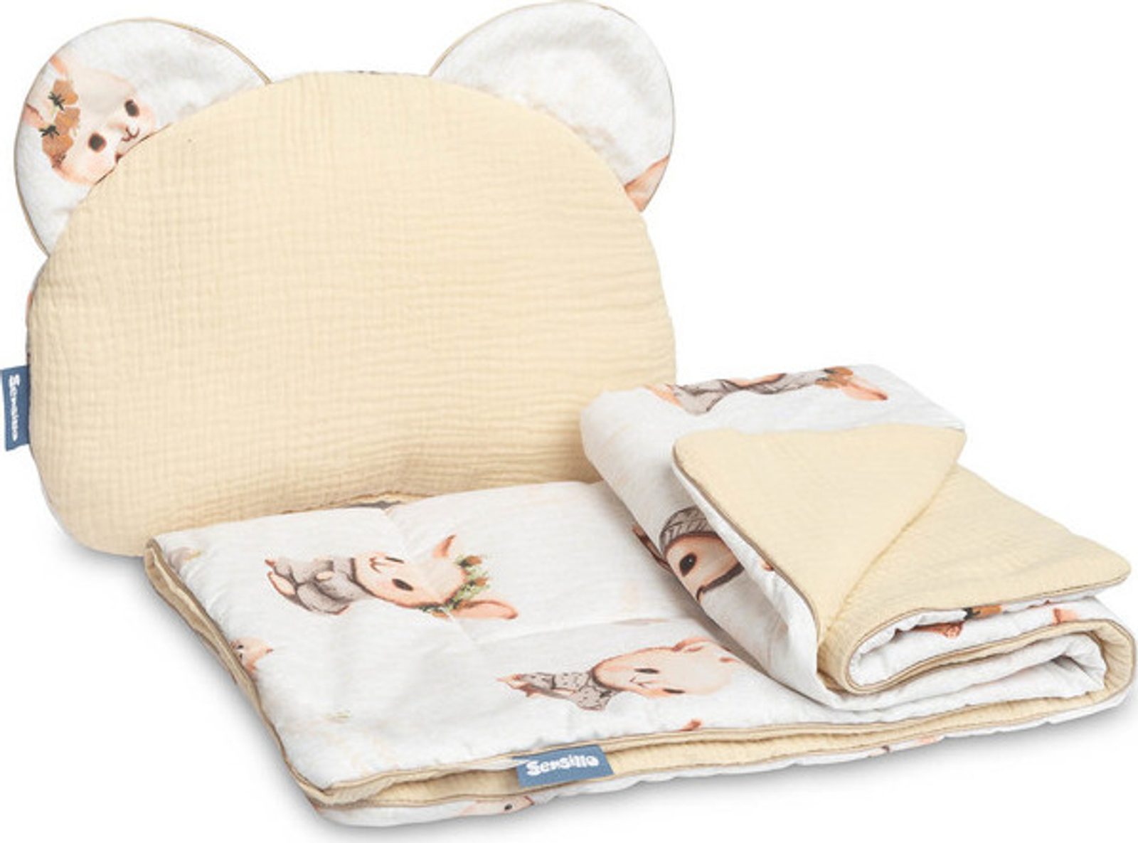 Sada obsahuje polštář a přikrývku z na dotek příjemného mušelínu a bavlny. Set se skvěle hodí do kočárku, postýlky nebo jako měkká podložka pro vaše miminko. Polštář samotný lze použít jako plyšovou hračku. Souprava je vyrobena ze dvou materiálů - vnitřek je 100% bavlna a vnější je jemný mušelín.