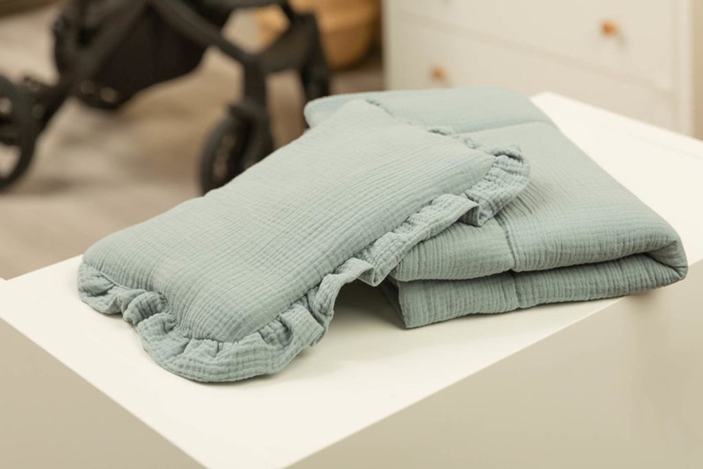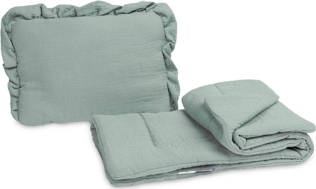 Sada obsahuje polštář a přikrývku z na dotek příjemného mušelínu. Set se skvěle hodí do kočárku, postýlky nebo jako měkká podložka pro vaše miminko. Polštář samotný lze použít jako plyšovou hračku. Souprava je vyrobena ze dvou materiálů - vnitřek je 100% bavlna a vnější je jemný mušelín.