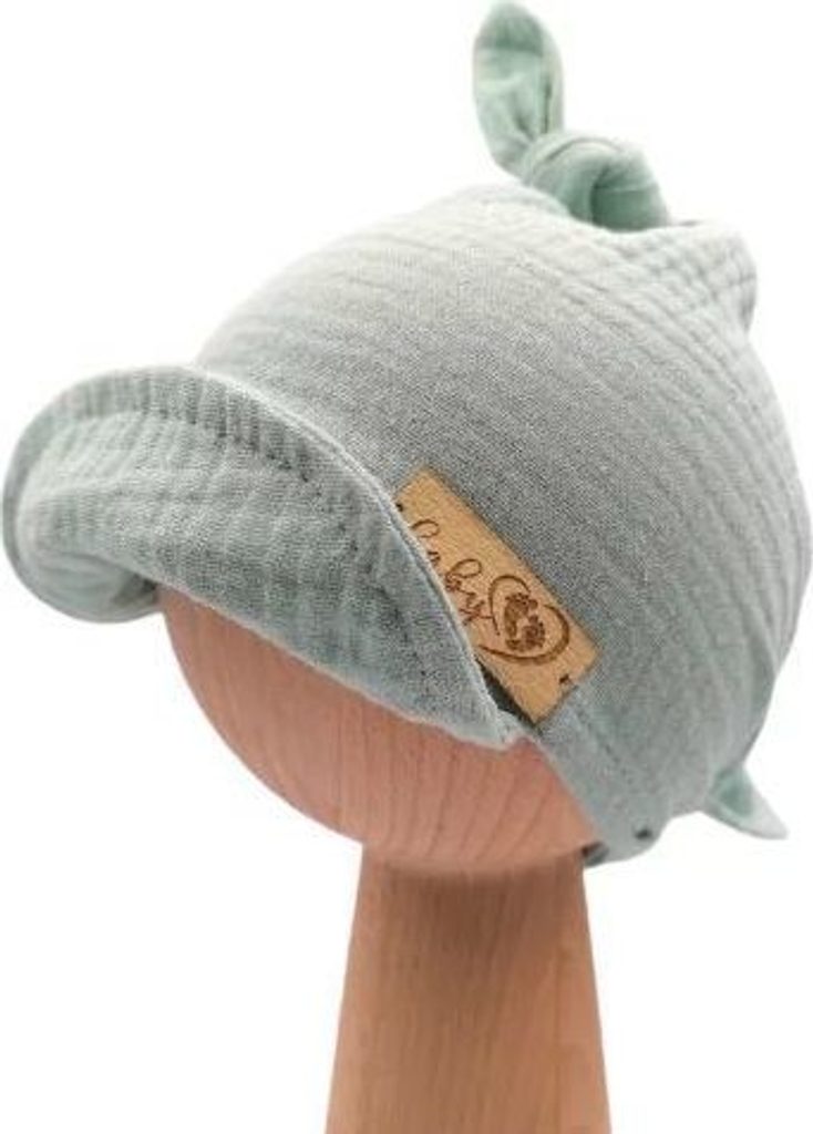 Šátek s kšiltem, ideální pro miminka. Šátek ochrání před sluncem nebo větrem. Byl vyroben ze 100% mušelínové tkaniny, díky čemuž je ideální na léto. Šátek se zavazuje vzadu a pasuje na každou hlavičku - roste s dítětem.