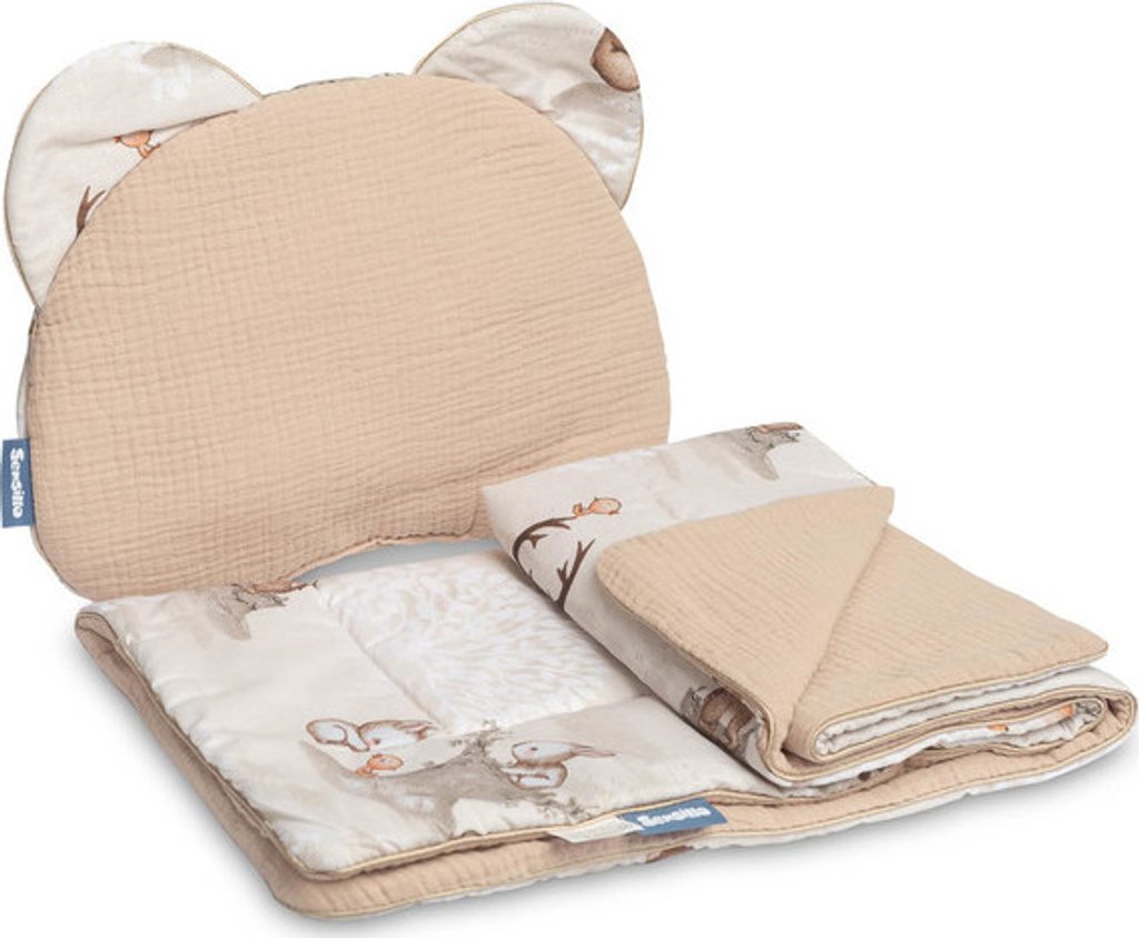 Sada obsahuje polštář a přikrývku z na dotek příjemného mušelínu a bavlny. Set se skvěle hodí do kočárku, postýlky nebo jako měkká podložka pro vaše miminko. Polštář samotný lze použít jako plyšovou hračku. Souprava je vyrobena ze dvou materiálů - vnitřek je 100% bavlna a vnější je jemný mušelín.