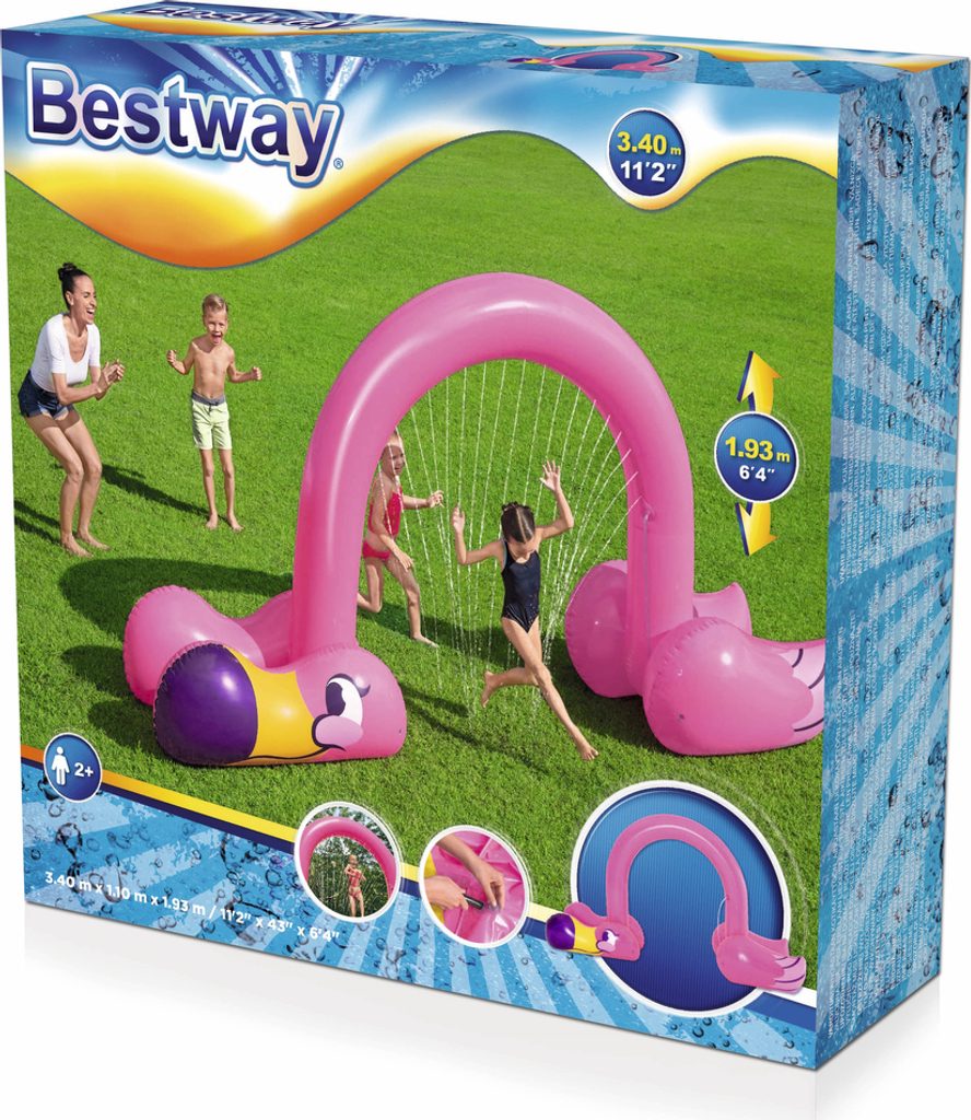 Velká nafukovací branka s rozprašovači s motivem plameňáků a kreativními funkcemi umožní dětem objevovat a využívat fantazii při venkovních aktivitách a hře. Nyní můžete zapomenout na nudné zavlažovače. Plameňák je vysoký 1,93 m, takže se do zábavy mohou zapojit i dospělí.