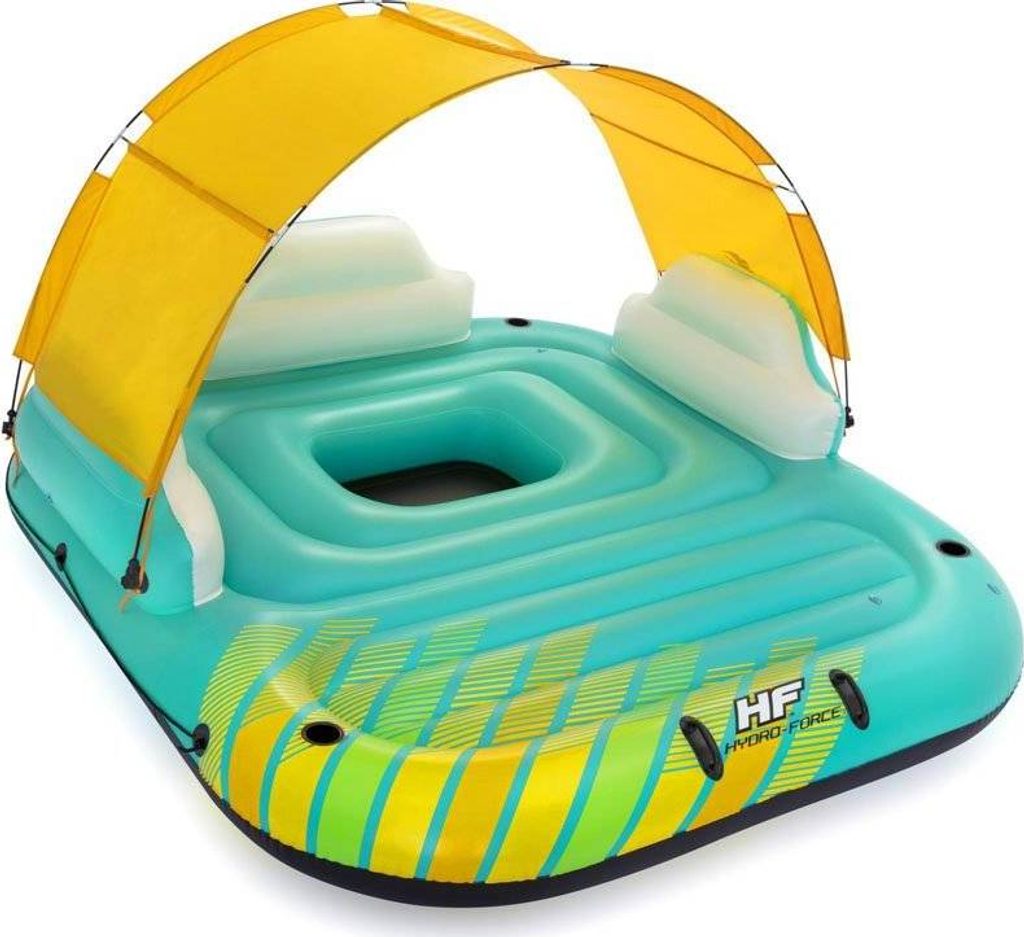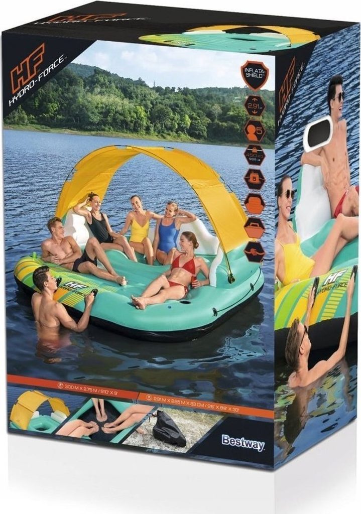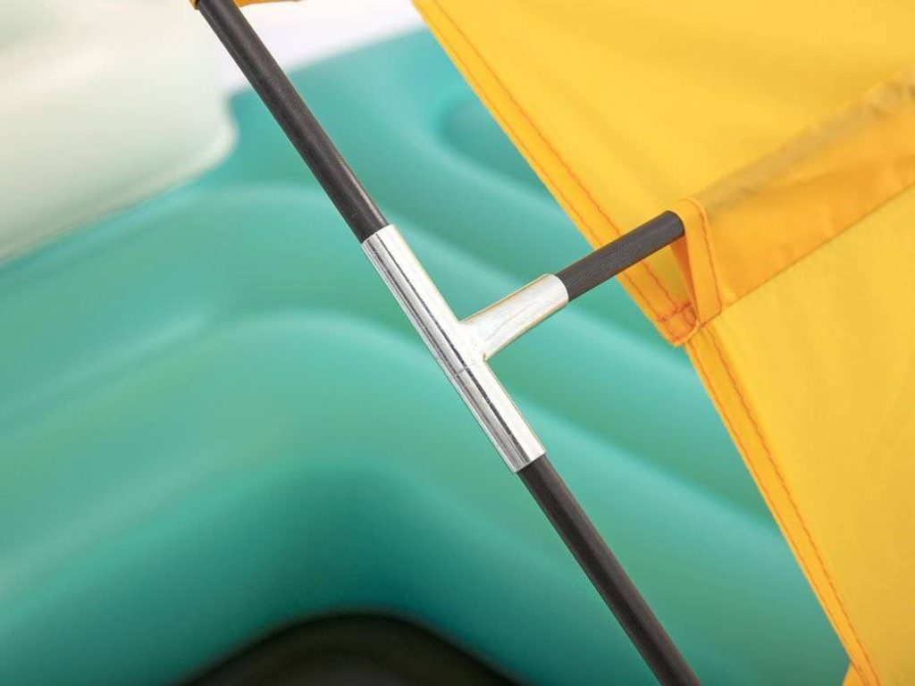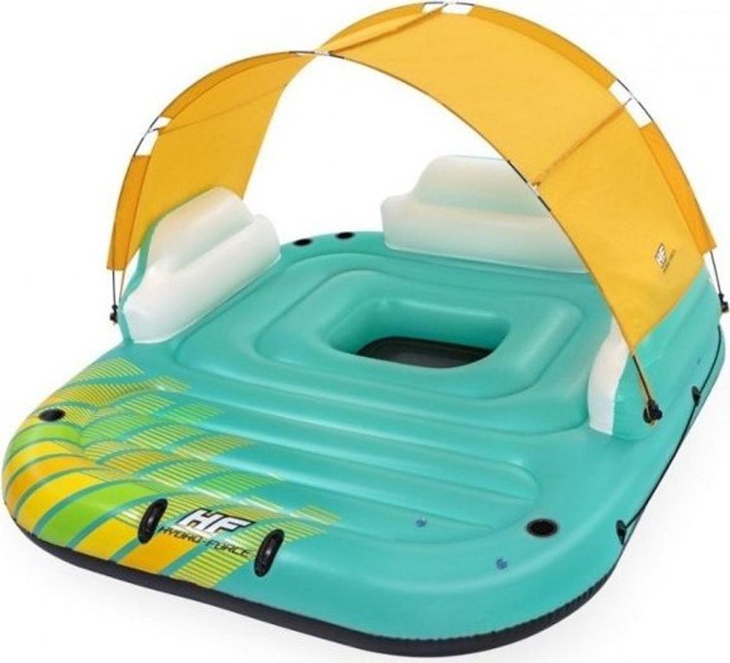 Systém, který je součástí matrace, zajišťuje, že je dostatečně pružná. Žlutou stříšku, která chrání před slunečními paprsky, lze snadno sejmout a odstranit tak stín, takže matrace je ideální i pro opalování. Nafukovací opěrky zad vám zajistí pohodlí a držáky na nápoje usnadní rychlý přístup k vašim oblíbeným nápojům.