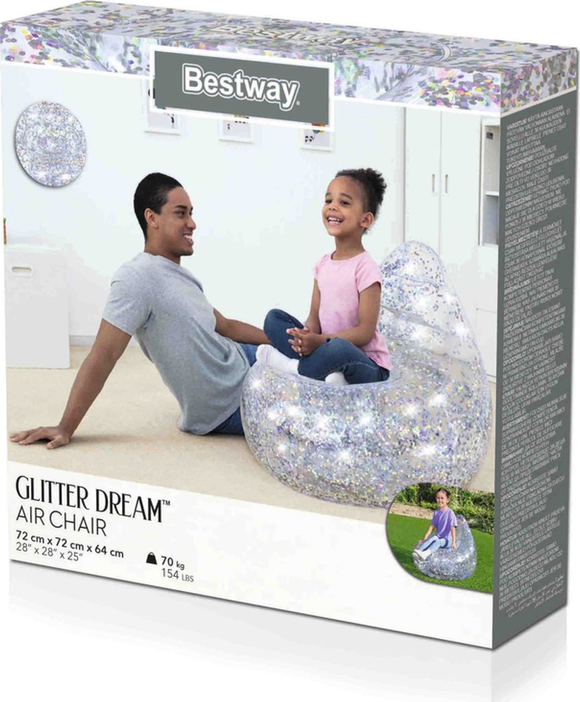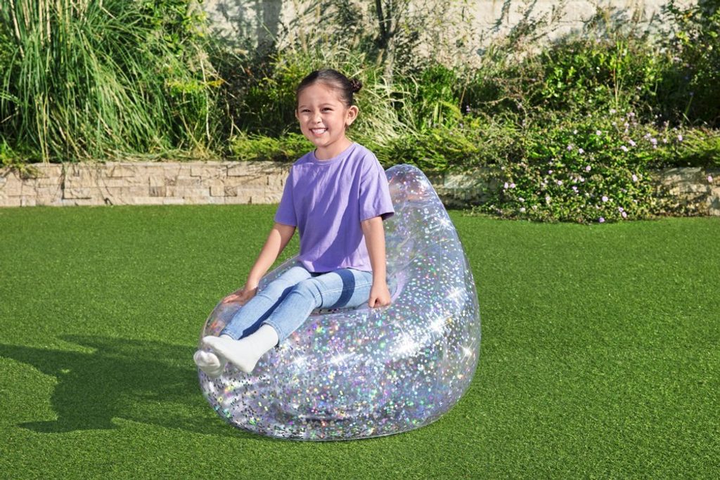 Nafukovací křeslo se snadno staví, vyžaduje minimální úložný prostor a je super pohodlné. Díky pevné konstrukci a prostornému povrchu je tato židle jako stvořená do dětského pokoje vašeho dítěte. Design židle poskytne maximální pohodlí, ať už ležíte, natahujete se nebo sedíte vzpřímeně. Křeslo plné třpytek jistě upoutá pozornost těch nejmenších. Navíc je ideální pro vnitřní i venkovní použití.