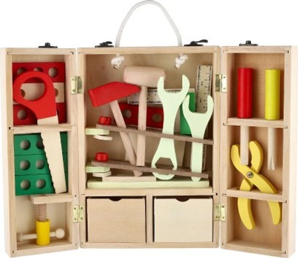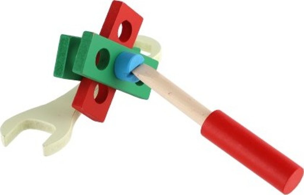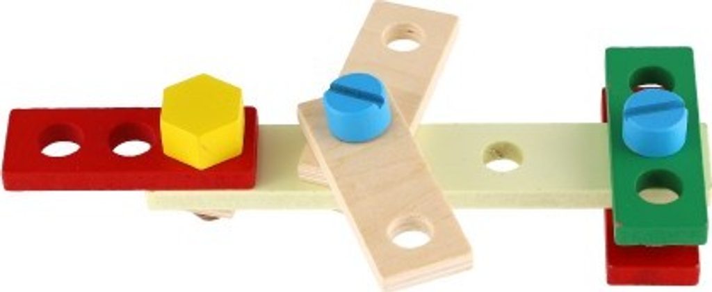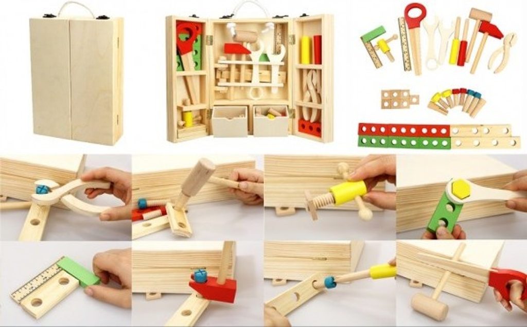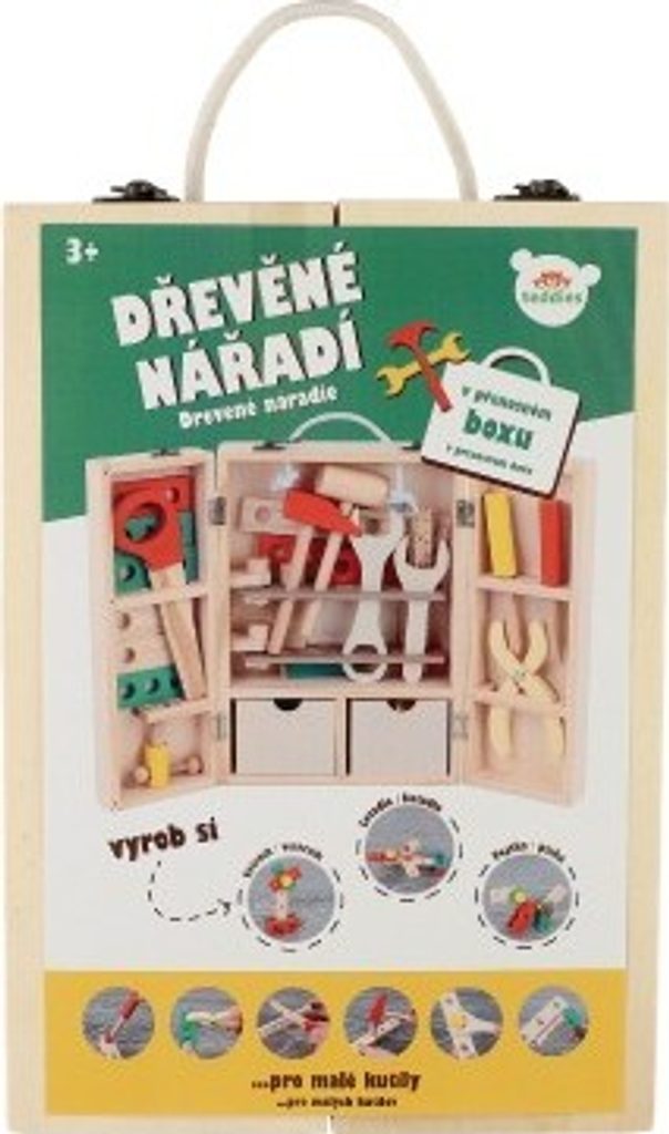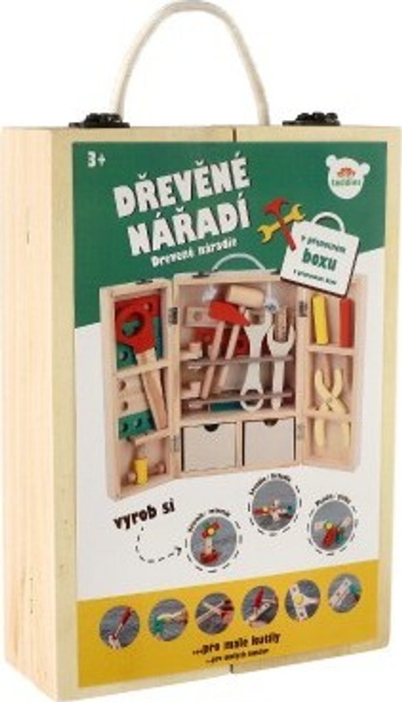 Dřevěný kufřík s nářadím obsahuje šroubováky, kladívka, klíče, matice, šrouby, úhelník, pravítko, pilu a spoustu dalšího. Hračka pomáhá rozvíjet technické chápání a jemnou motoriku rukou. Pro všechny malé kutily.