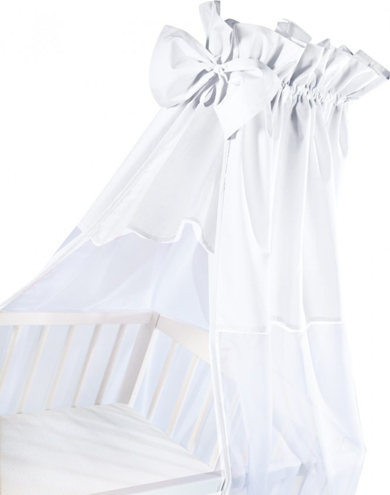 Nebesa Klups univerzální bílá. Horní část nebes je vyrobena ze 100% bavlny, spodní část je vyrobená z bílé průsvitné organzy (šifonu). Nebesa se umísťují na držák nebes, který není součástí jejich balení a je nutné jej zakoupit zvlášť.