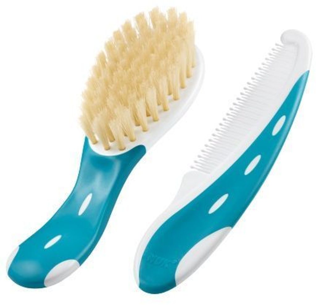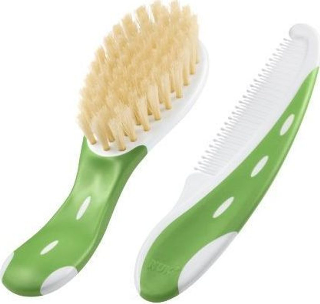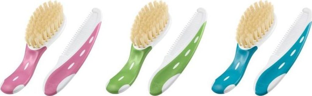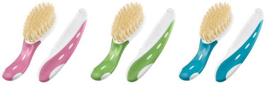 Kartáček z měkkých přírodních štětin jemně masíruje citlivou hlavičku miminka. Hřeben má zaoblené zoubky pro ochranu hlavičky miminka. Speciální rukojeti umožňují bezpečné držení a zajišťují bezpečnost vás i vašeho dítěte. Sada dětských kartáčků NUK je ideální pro každodenní péči od narození.