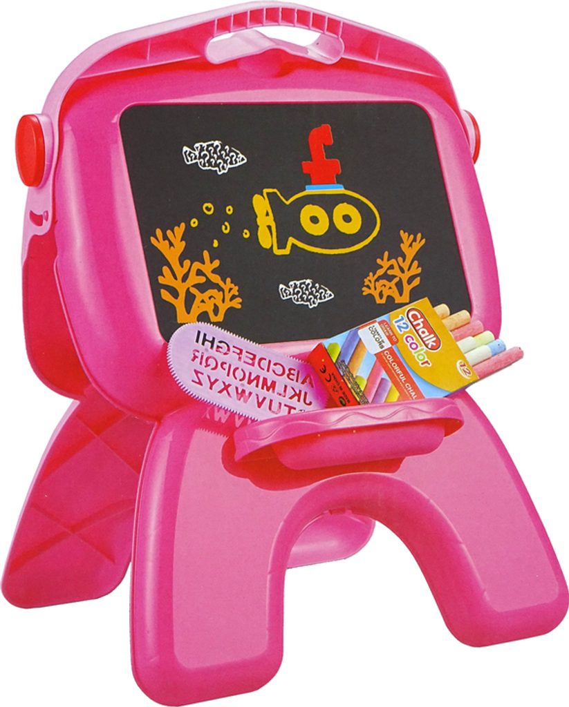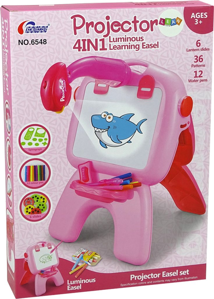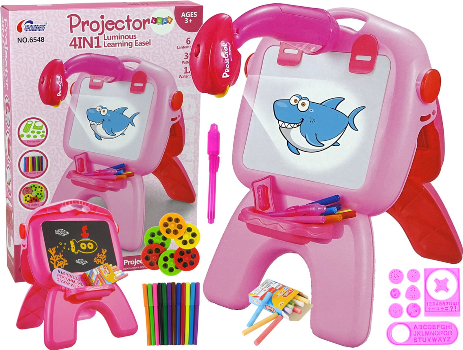 Deska je velmi pěkně a pečlivě vyrobená, rozkládá se na dvě strany. Dvě kreslicí plochy - bílá, určená pro použití se smazatelnými fixy, a černá, na kterou lze kreslit křídou. Může být umístěn kdekoli v místnosti. Navíc má zásuvky, kam můžete umístit značky, křídu nebo obrázky k zobrazení. Projektor umístěný v horní části desky zobrazuje různé obrázky zvířat a postav, které lze nakreslit na povrch desky. Šablony v sadě naučí vaše dítě vhodné názvy geometrických obrazců a psaní písmen.