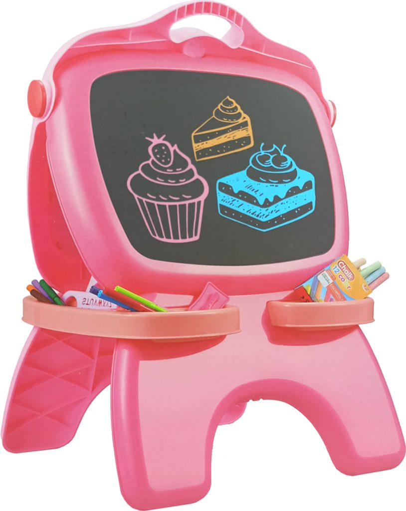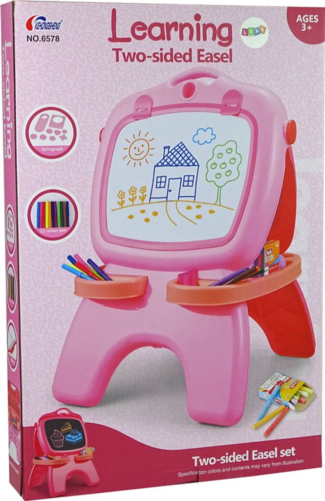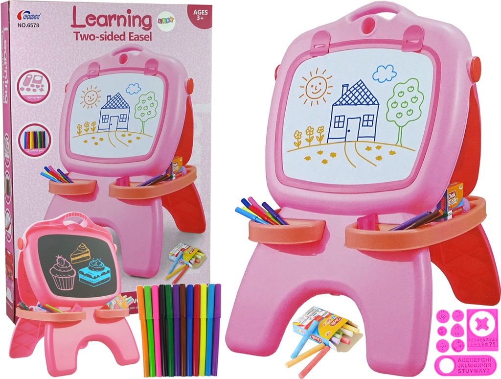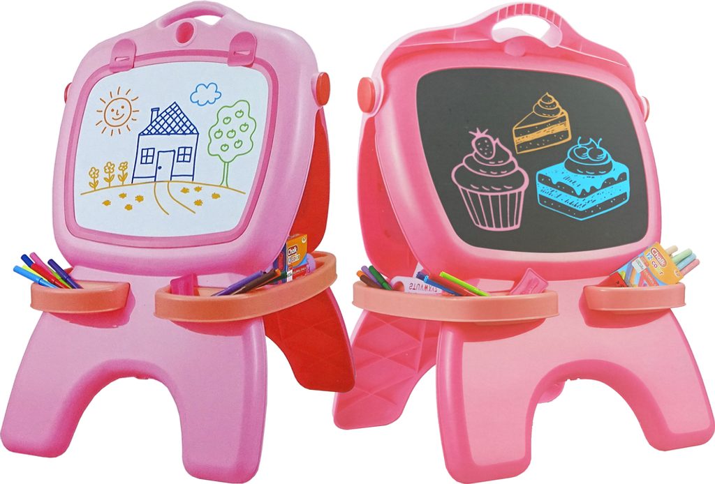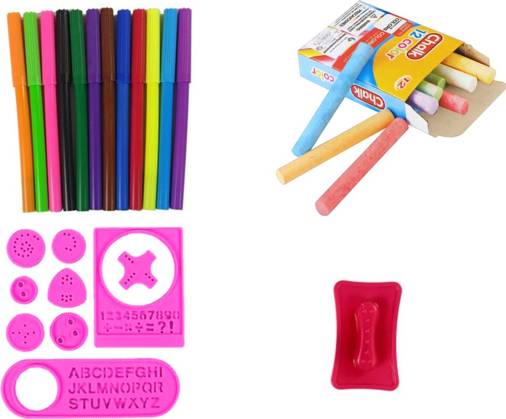 Tabule má dvě kreslicí plochy - bílou, určenou pro použití se stíracími fixy, a černou, na kterou lze kreslit křídou. Sada obsahuje 12 kusů barevných fixů a sadu 12 kusů kříd.