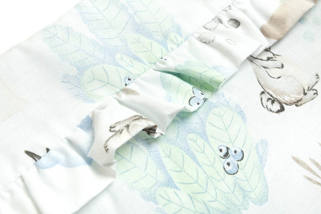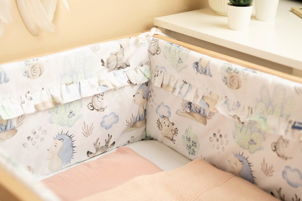Ochranný mantinel do postýlky se hodí do každé standardní postýlky. Vyniká krásnými materiály a všitým volánkem, díky kterému bude dětský pokojíček jedinečný. Chránič je vyroben z měkké bavlny s potiskem. Výplň z vaty ochrání dítě před zraněním při pohybu po postýlce. Udržení chrániče ve správné poloze zajišťují hustě šité stuhy sloužící k připevnění k příčkám postýlky. Byl navržen pro postýlku o rozměrech 120x60 cm. Chránič bude skvělým doplňkem dětské výbavičky.