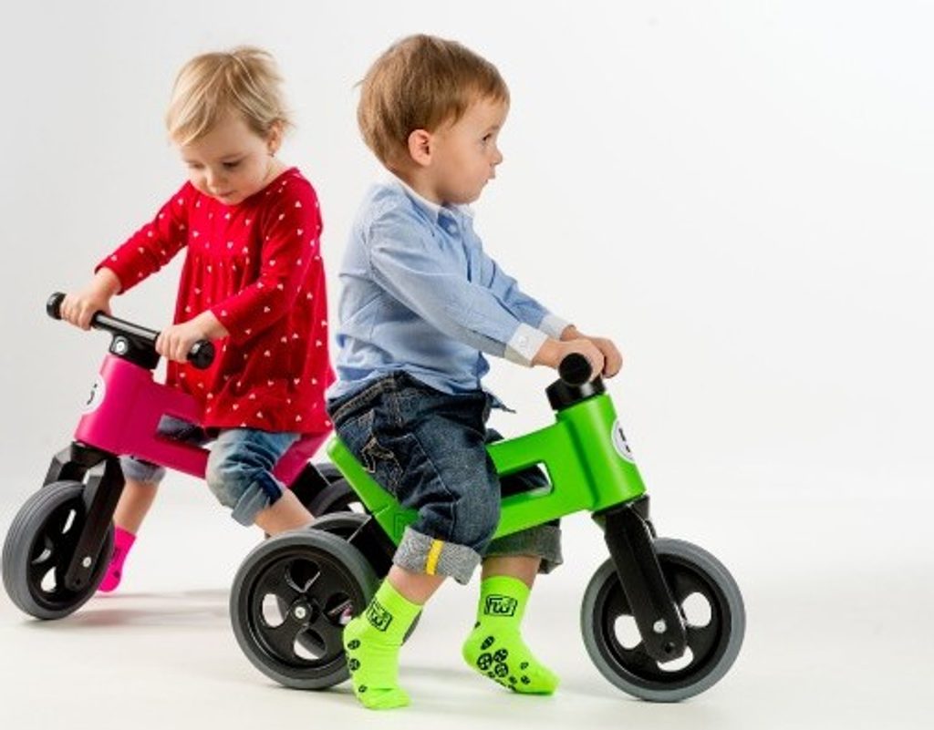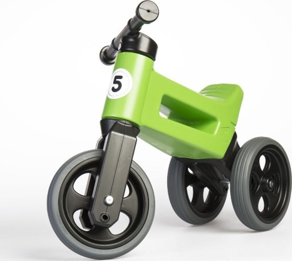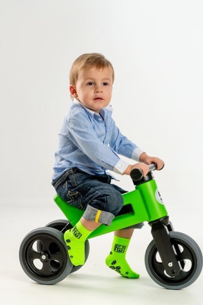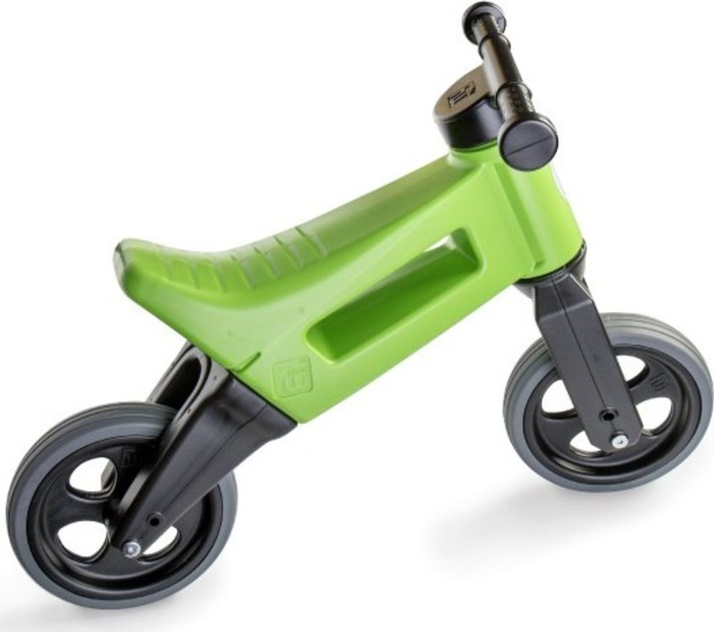 FUNNY WHEELS SPORT novinka s pneumatikami, díky kterým má odrážedlo tichý provoz a kola se nekloužou. A jedééém! FUNNY WHEELS je originální české odrážedlo, které dokáže růst s vaším dítětem. Vzhledem k tomu, že můžete vyměnit dvě zadní kola za jedno a nastavit jeho výšku, nemusíte kupovat každý rok nové odstrkovadlo. FUNNY WHEELS vám vydrží, dokud nebudete kupovat první kolo. Hlavní výhody FUNNY WHEELS: 2v1 – během pár minut změníte tříkolové odrážedlo na dvoukolové 2 výškové polohy – nastavíte vpředu i vzadu (rozdíl 3 cm) Tiché pneumatiky, které nekloužou na výběr v 6 barvách – zelená, červená, modrá, růžová, oranžová, šedá cool design bezpečné i pro ty nejmenší z odolného a nezávadného plastu, se zahlazenými spoji omyvatelné vlažnou vodou a mýdlovými čisticími prostředky kompletně vyrobené v České republice FUNNY WHEELS roste stejně, jako váš prcek. Ten začne jezdit na malém tříkolovém odrážedle, až se vytáhne, jednoduše FUNNY WHEELS zvednete o 3 cm výš a jede se dál. Až přijde čas trénovat balanc, jednoduše vyměníte dvě zadní kolečka za jedno a dítko se může začít připravovat na jízdu na kole. Jak přesně to funguje, vidíte na videu. Odstrkovadlo je přitom stabilní (ve variantě se třemi koly). Vidlice má omezený rozsah otáčení a řídítka se tak nemohou přetočit. Rukojeti řídítek jsou na konci rozšířené, a tím chrání dětské ruce před poraněním. Odrážedlo je hračka, která baví snad každé dítě. S FUNNY WHEELS si užije radost z pohybu, zlepší si své motorické schopnosti a koordinaci, natrénuje pozornost, rovnováhu a třeba si i zazávodí! Vaše společné procházky budou delší, rychlejší a zábavnější. Technické parametry: doporučený věk: od 18 měsíců nosnost: 25 kg váha odrážedla: 2,10 kg výška sedla: 28/31 cm šířka řídítek: 30 cm rozteč zadních kol: 20 cm průměr kola:19 cm šířka pneumatiky: 4 cm Odrážedlo koupíte sestavené jako tříkolové. Součástí balení jsou dva imbusy a kratší osa na zadní kolo pro úpravu odrážedla na dvoukolové. Je možné zakoupit i náhradní díly – samostatná kola a osy.