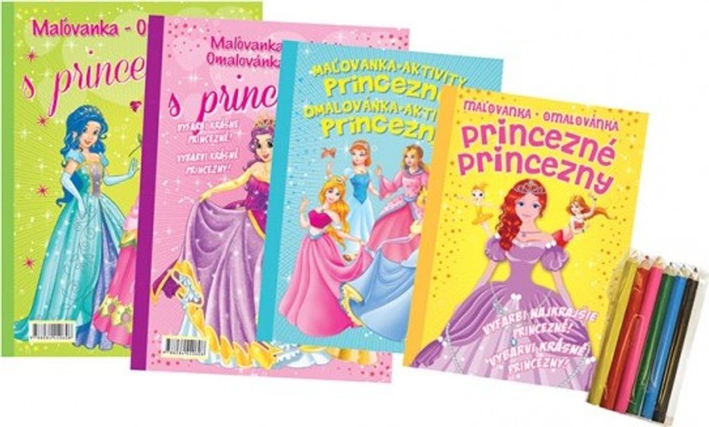 Omalovánky+aktivity/Maľovanky+aktivity Princezny/princezné +pastelky CZ+SK verze - mix 4 druhy