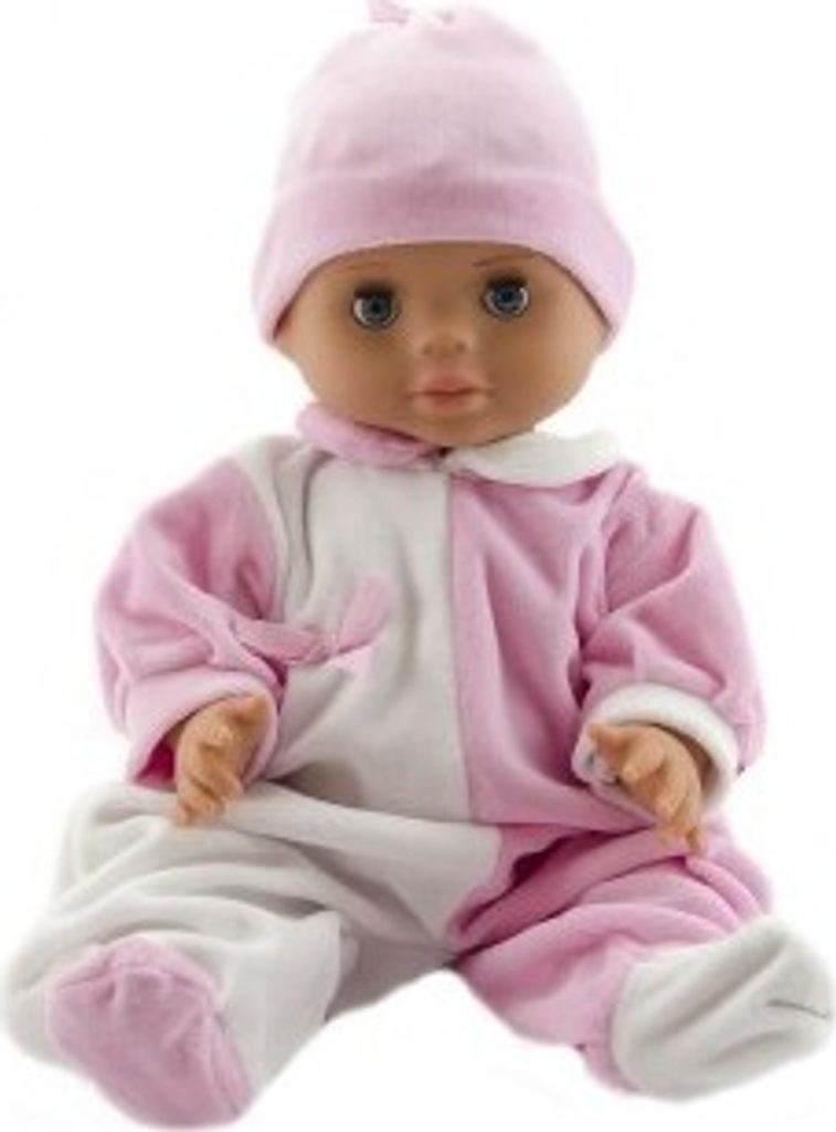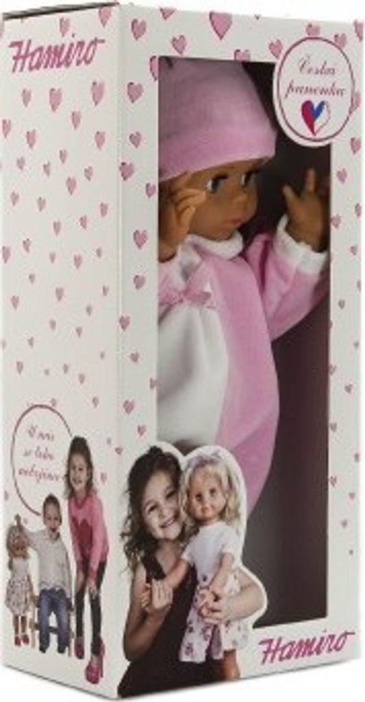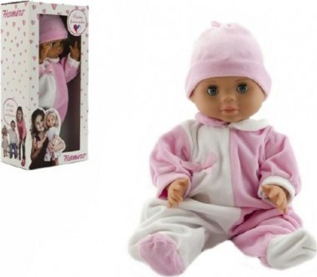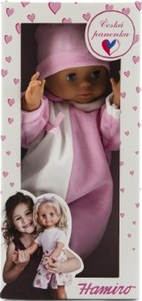 Roztomilé miminko v overalu s čepičkou si oblíbí každá holčička, která si chce hrát na maminku a starat se o své děťátko. Miminko má pevné tělo. Délka 40 cm.