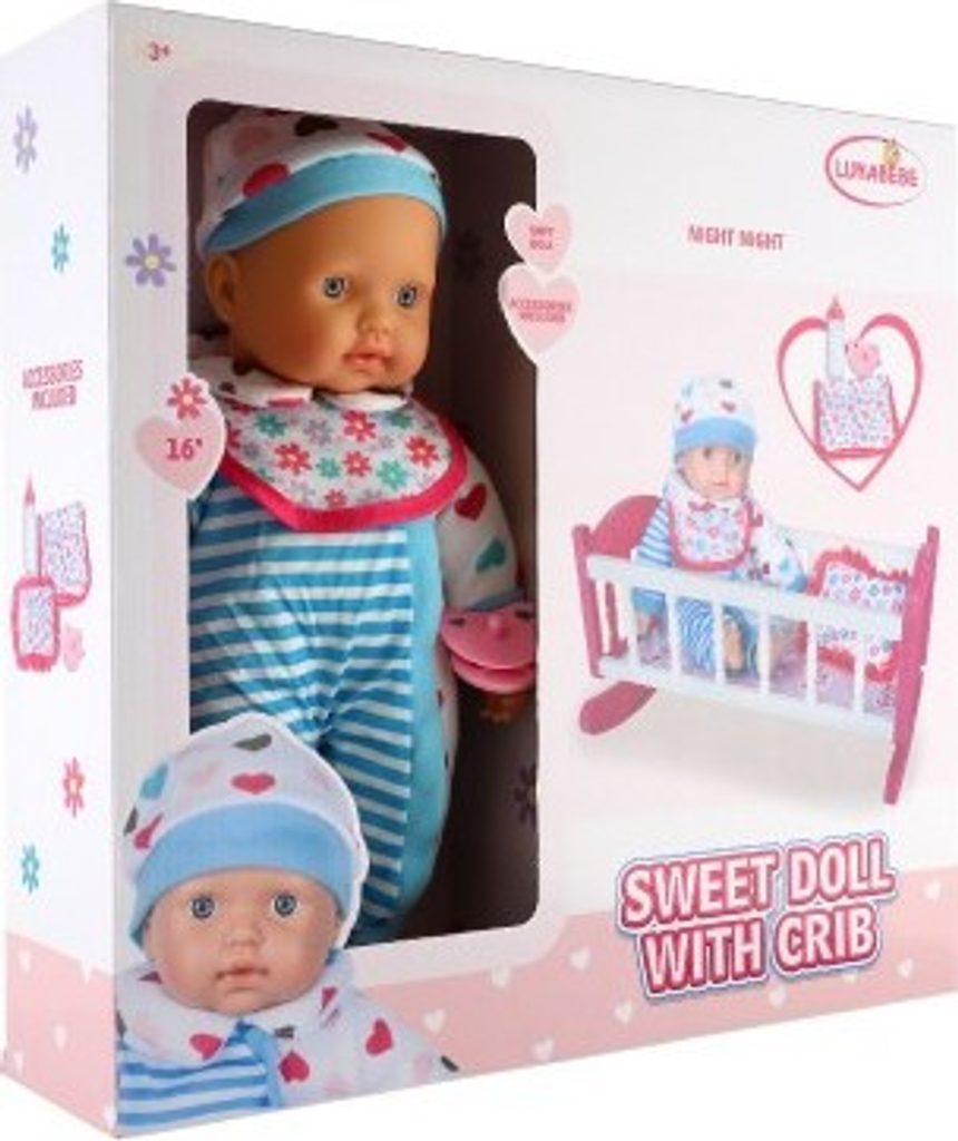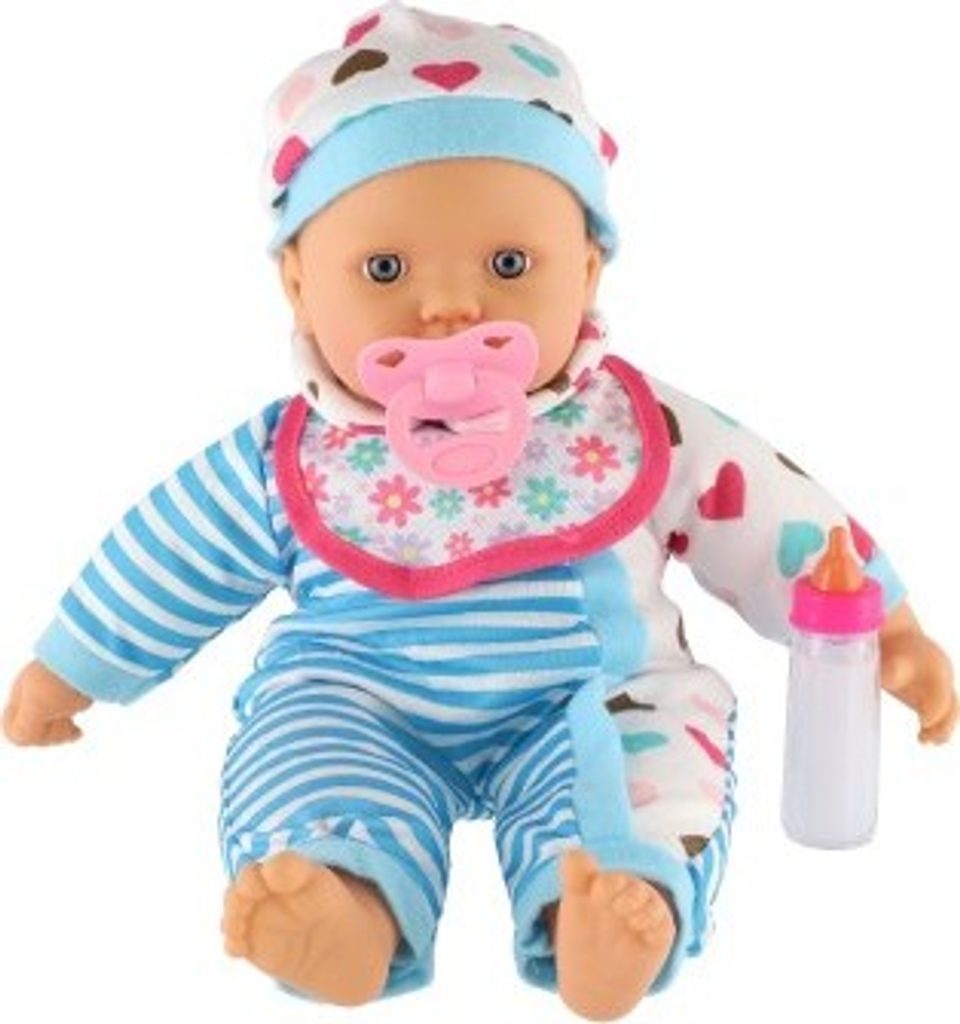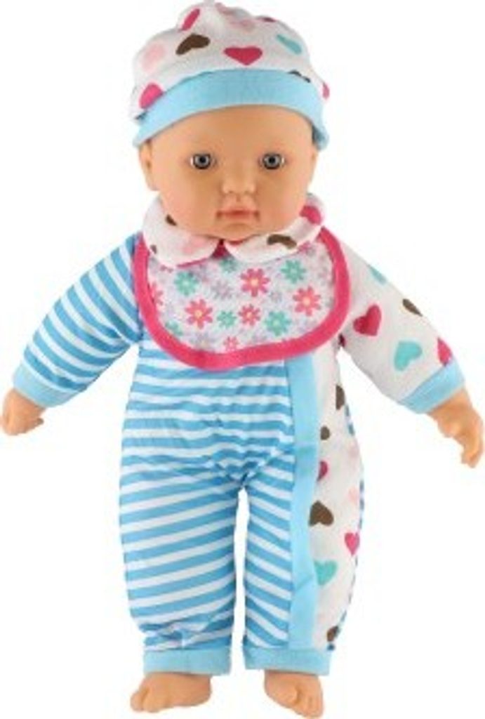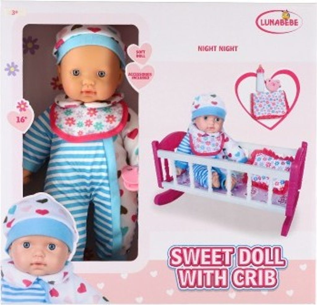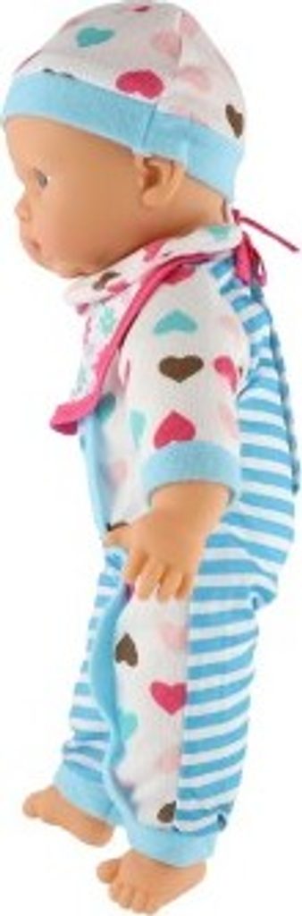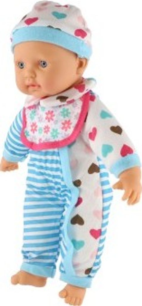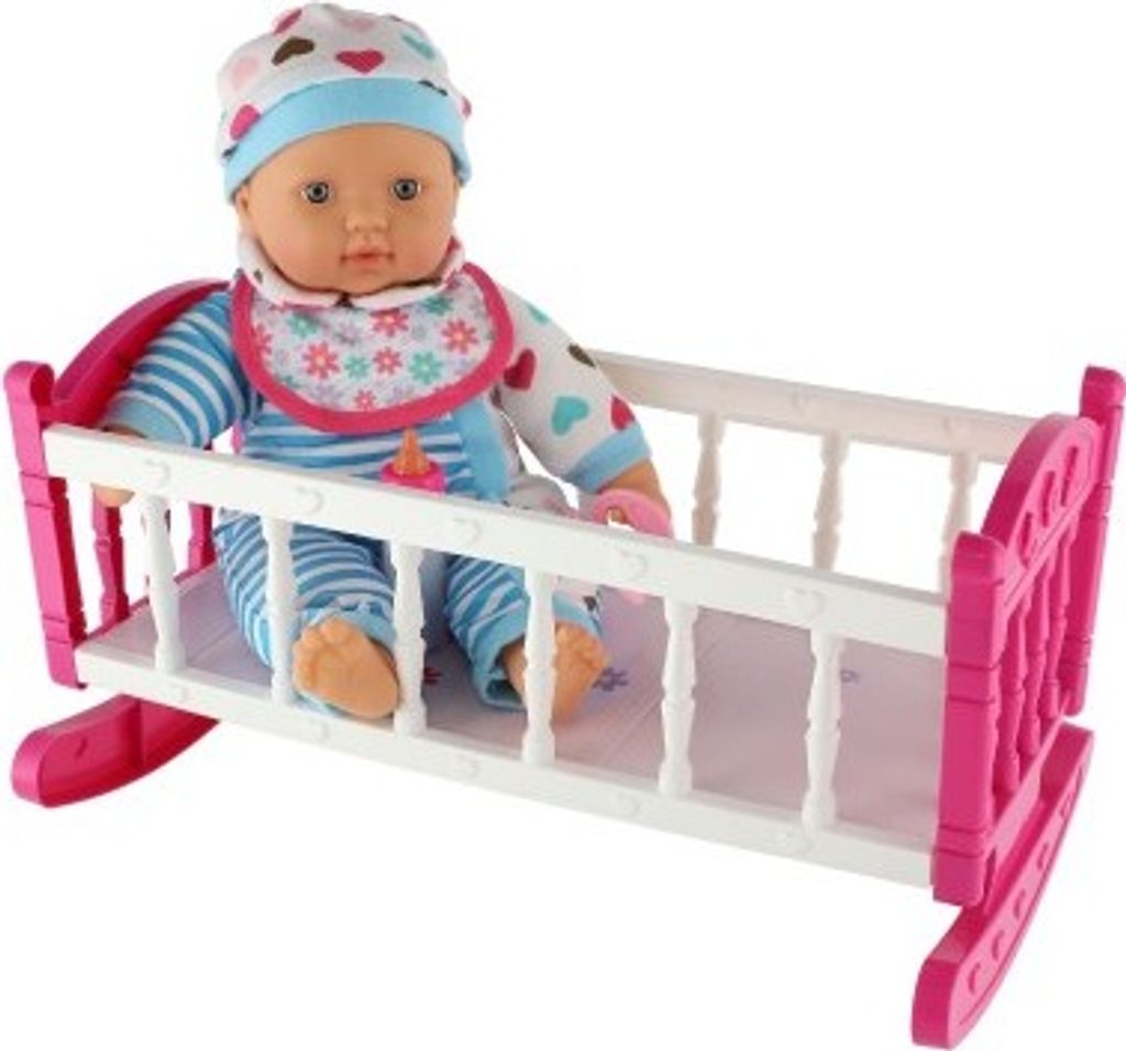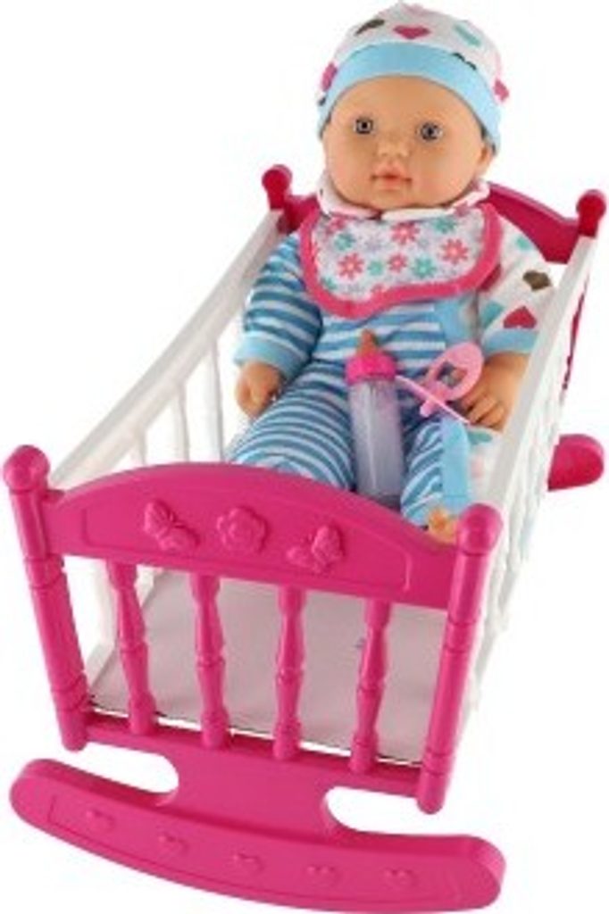 Roztomilá panenka s měkým tělíčkem v krásném oblečku. Toto miminko udělá jistě radost každé holčičce a stane se tak její nepostradatelnou součástí. Součástí balení je lahvička a dudlík, také bryndáček a nesmí chybět ani postýlka, které určitě každá maminka pro své miminko nutně potřebuje. Velikost panenky: 38 cm .