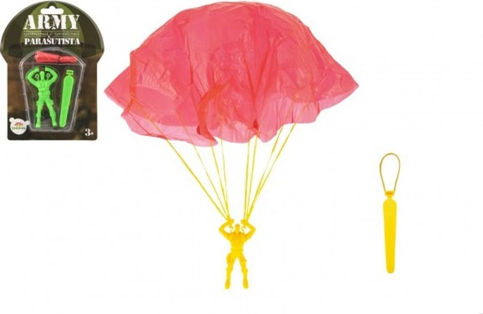 Plastová postavička parašutisty s padákem. Tato hračka jistě potěší každého malého dobrodruha. Sportovní hračka ideální na hrátky na zahradě. Běhej a vyhazuj parašutistu do největší výšky, překonávej délku jeho letu! Při pádu se padák nafoukne a zpomalí pád panáčka - jako opravdový parašutista!