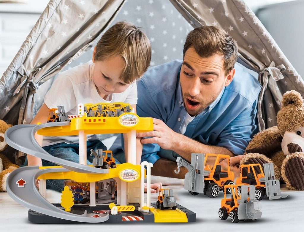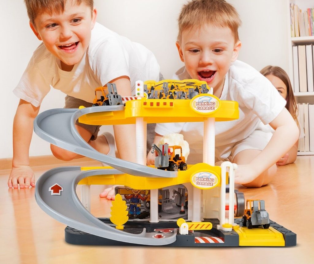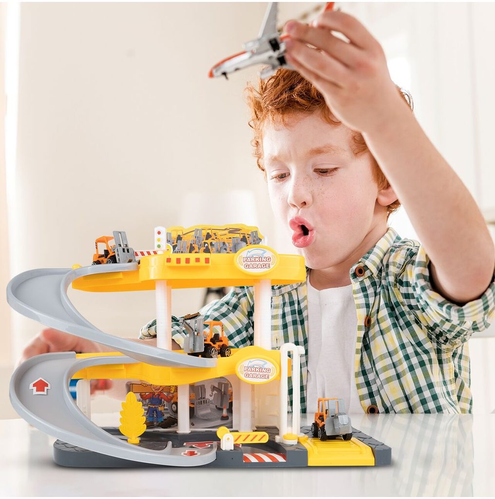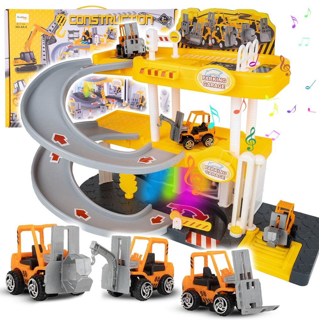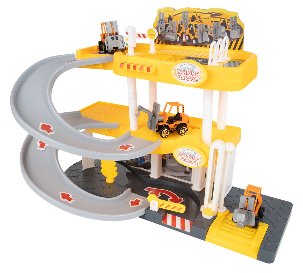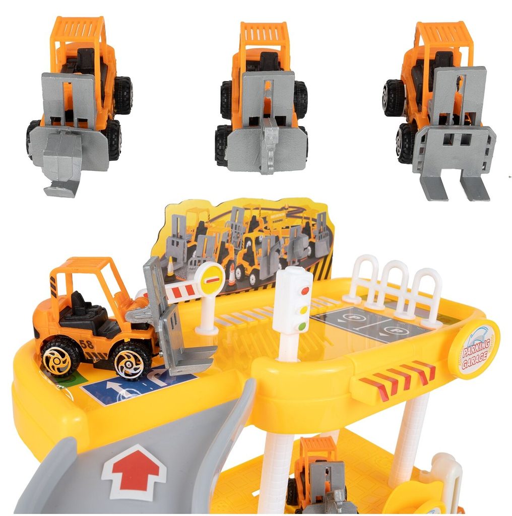 Dětská garáž se 3 stavebními stroji a příslušenstvím Construction Parking. Podlaží jsou propojena sjížděcí dráhou. Garáž má ve výbavě modul na baterie, který vydává zvuky a osvětluje první podlaží. V garáži jsou umístěny dopravní značky, závora a nechybí ani samolepky. Mladý motoristický nadšenec zde nalezne vše co potřebuje. Je vyrobena z plastu bez ostrých hran a určena pro děti od 3 let.