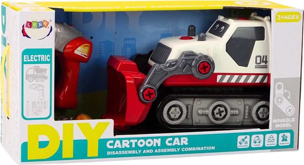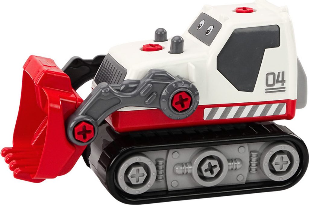 Demontážní pásový bagr je hračka, která děti zavede do světa mechaniky. Autentičnost dodává bílá barva a pohyblivá lžička. Sada nástrojů - vrtačka, šroubovák, tři bity - umožňuje nezávislé zkoumání a hru.