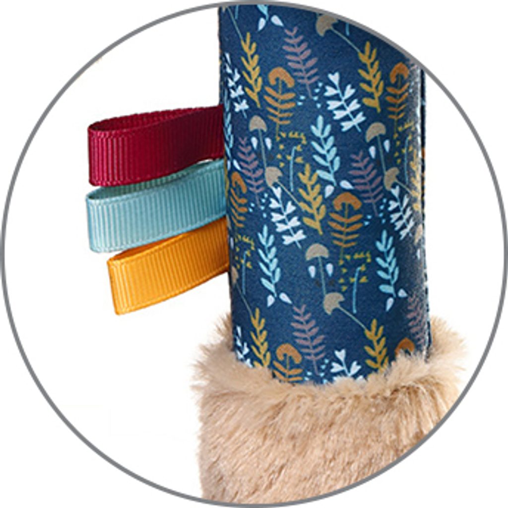 Měkké uši podporují dotyky a barevné vyčnívající štítky umožňují trénink malých ručiček.