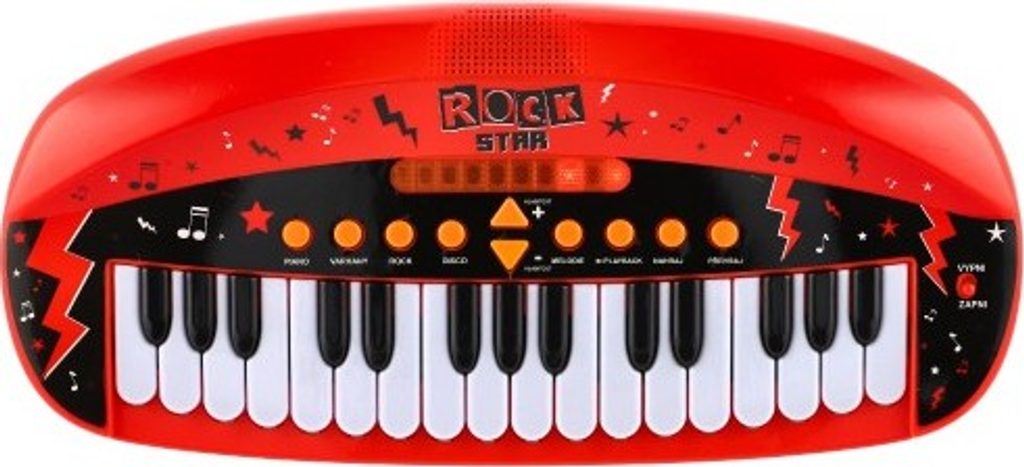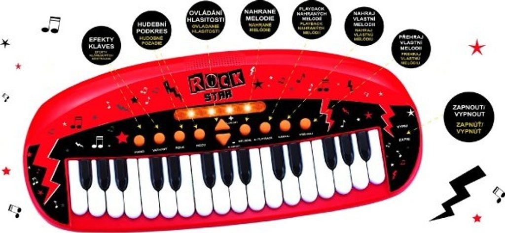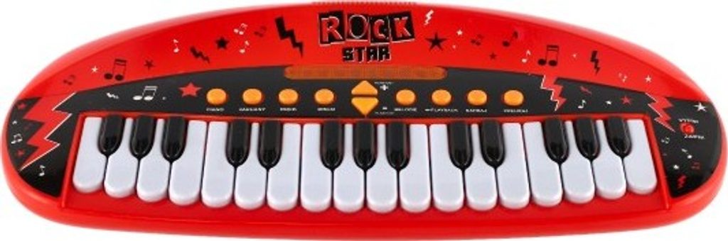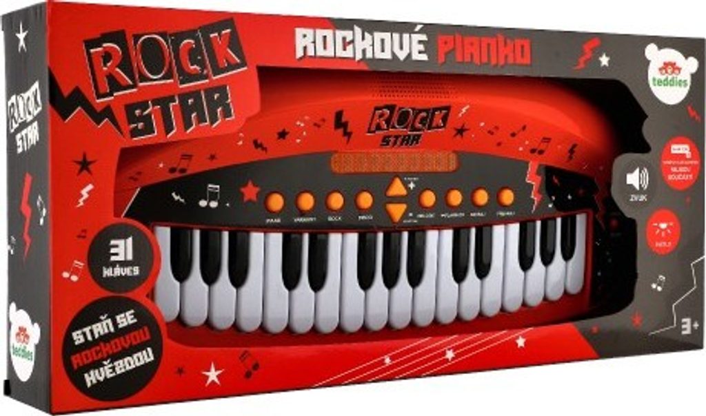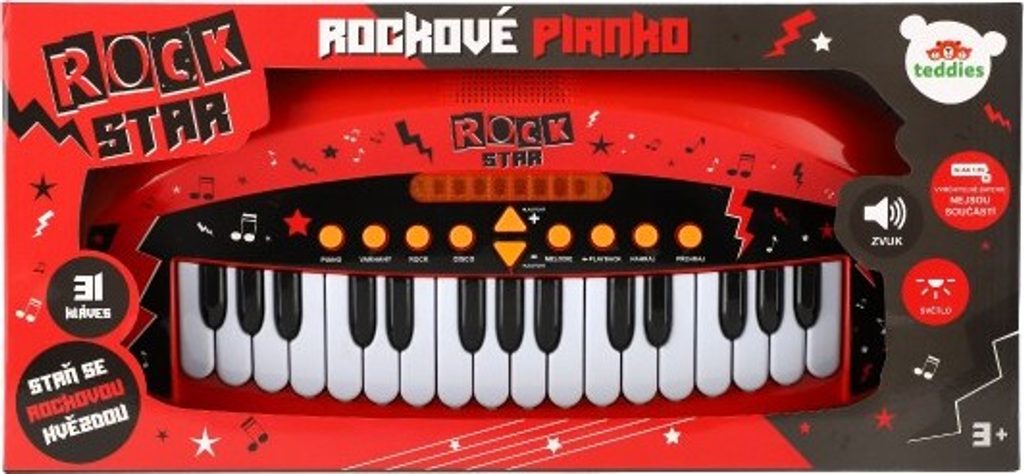Dětské pianko, které rozhodně nesmí chybět žádnému milovníkovi hudby a to nejen té rockové! Pianko má mnoho efektů a fukncí - světelné efekty, efekt kláves, hudební podkres, ovládání hlasitosti, nahrané melodie, playback, možnost nahrát svou vlastní melodii a také jí později přehrát. Pianko má 31 kláves.Tak co, připraveni na rockový koncert?
