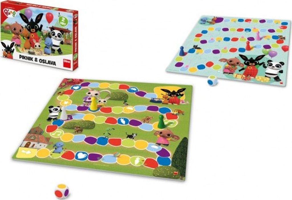 Jestli něco králíček Bing miluje, jsou to oslavy a chození na piknik. Díky dvěma zábavným deskovým hrám se mohou tentokrát zúčastnit i vaše děti. Zahrajte si s Bingem a jeho kamarády 2 zábavné hry. Můžet se vydat na PIKNIK, po cestě čelit nástrahám a plnit zábavné úkoly. Nebo buďte první, kdo přijde na OSLAVU Bingových narozenin. Ale pozor na barevné Hoppity, tyrkysoví vám cestu zrychlí, ale růžoví vás pošlou zpět. Pohyb po cestě určuje barevná kostka. Hry jsou proto vhodné pro malé děti, které neumí počítat.