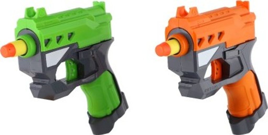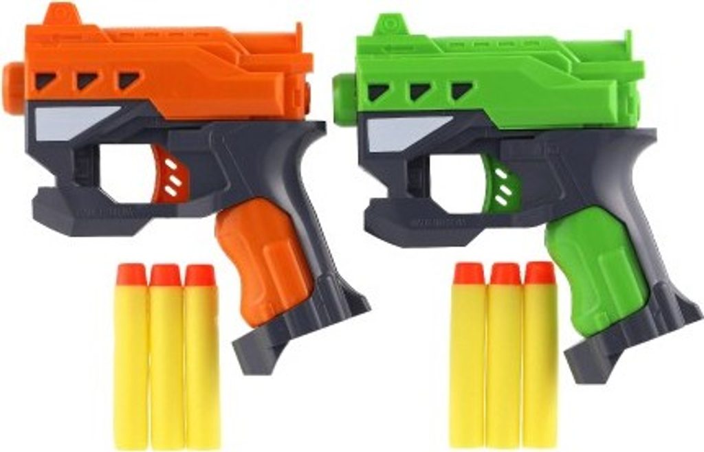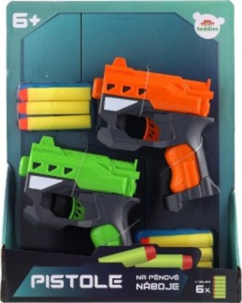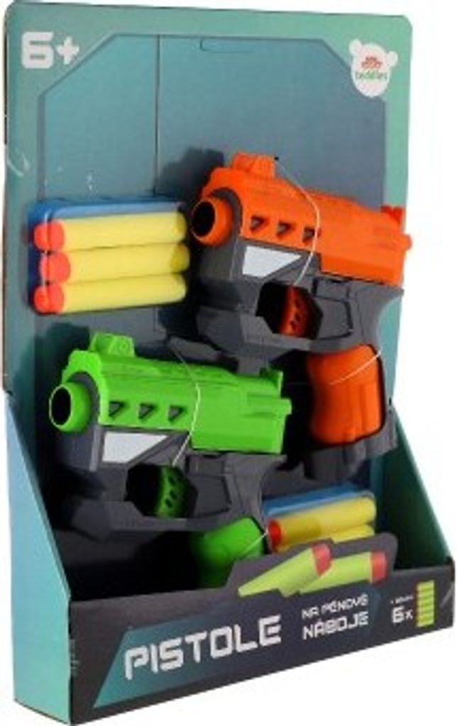 Hravá zábava nejen pro kluky! Pistole na pěnové náboje zabaví každého malého pistolníka. Náboj umístěte do komory pistole a natáhněte kohoutek. Teď už stačí jen dobře zamířit a vystřelit na svého protivníka! V balení jsou dvě pistole, ideální tak pro tebe i tvého kamaráda nebo sourozence. Každý budete mít k dispozici tři náboje a hra tak může začít!