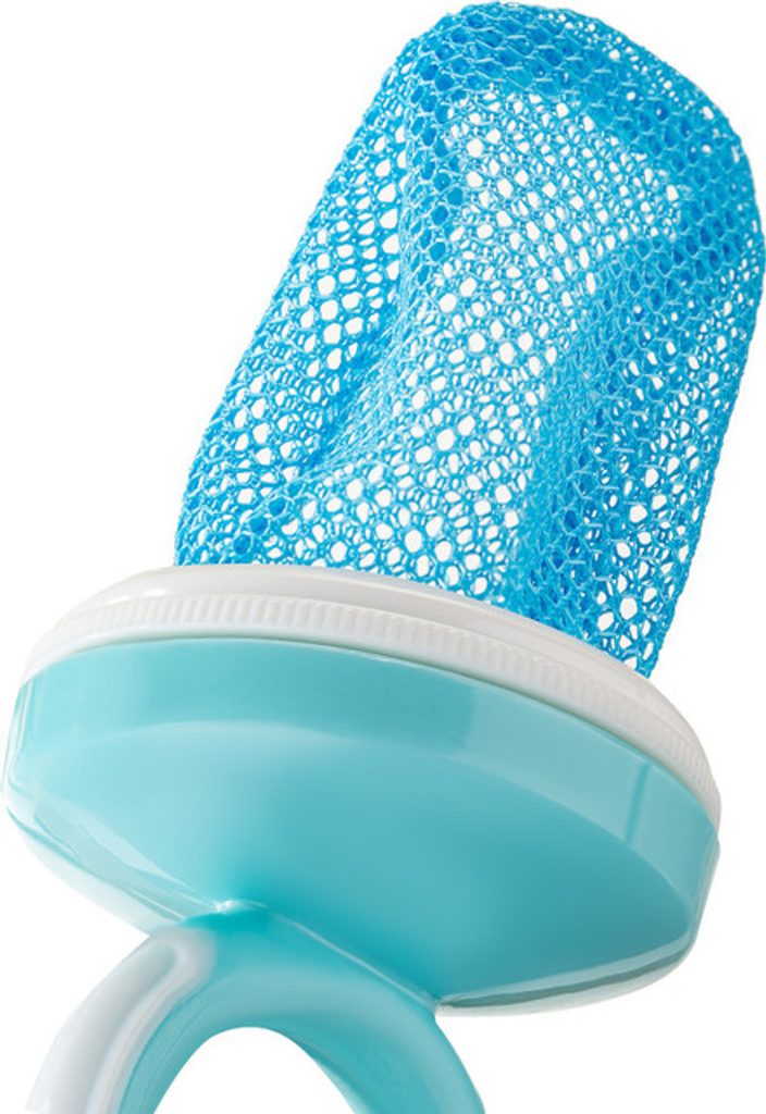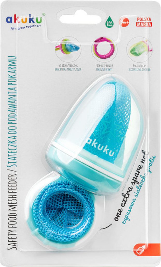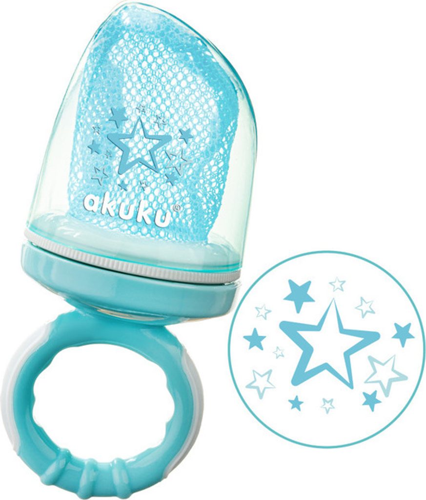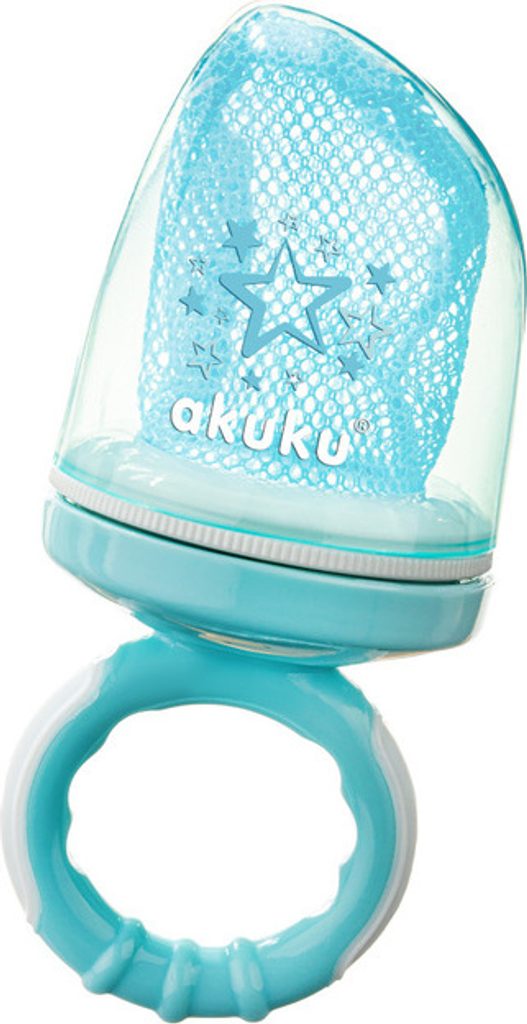 Dudlík "akuku" se používá k bezpečnému podávání čerstvého ovoce, zeleniny, sýrů nebo sušenek. Zvláště užitečné při přechodu na pevnou stravu. Eliminuje riziko udušení neúplně rozžvýkanými kousky jídla. Ideální pro malé dětské ručičky. Ideální na procházky nebo cestování. Sada obsahuje uzávěr na ochranu síťoviny před nečistotami. Dá se použít i jako kousátko při prořezávání zoubků.