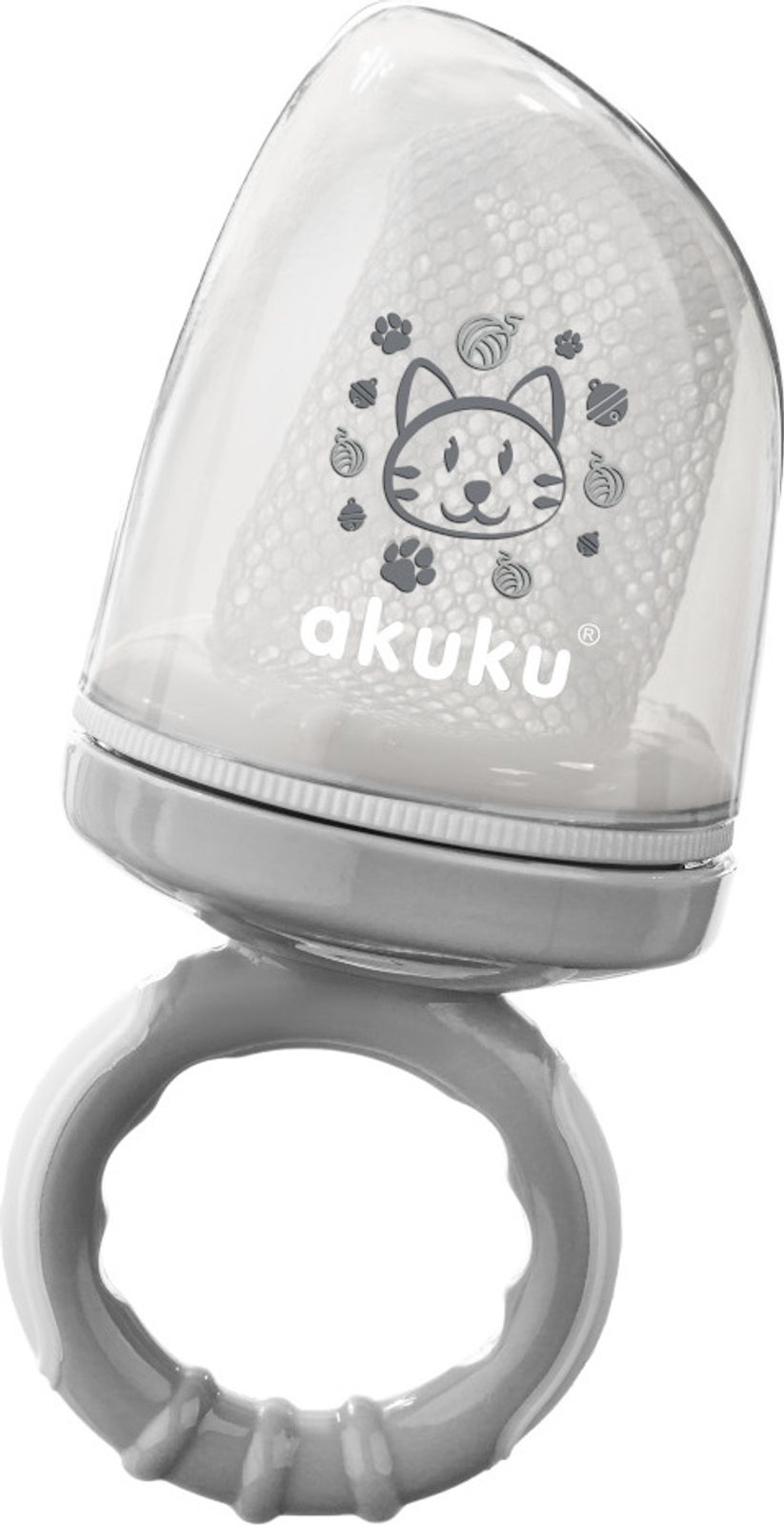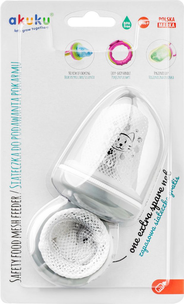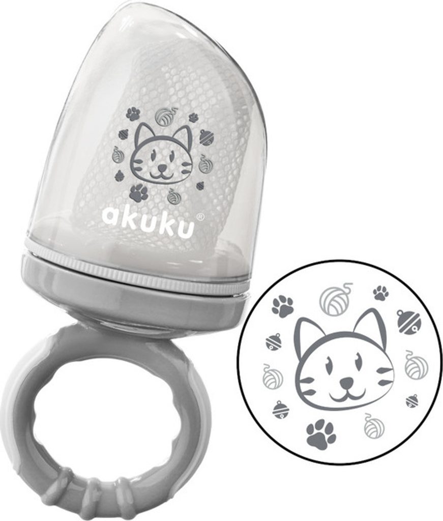 Síťka "akuku" se používá k bezpečnému podávání čerstvého ovoce, zeleniny, sýrů nebo sušenek. Zvláště užitečné při přechodu na pevnou stravu. Eliminuje riziko udušení neúplně rozžvýkanými kousky jídla. Ideální pro malé dětské ručičky. Ideální na procházky nebo cestování. Sada obsahuje uzávěr na ochranu síťoviny před nečistotami. Dá se použít i jako kousátko při prořezávání zoubků.