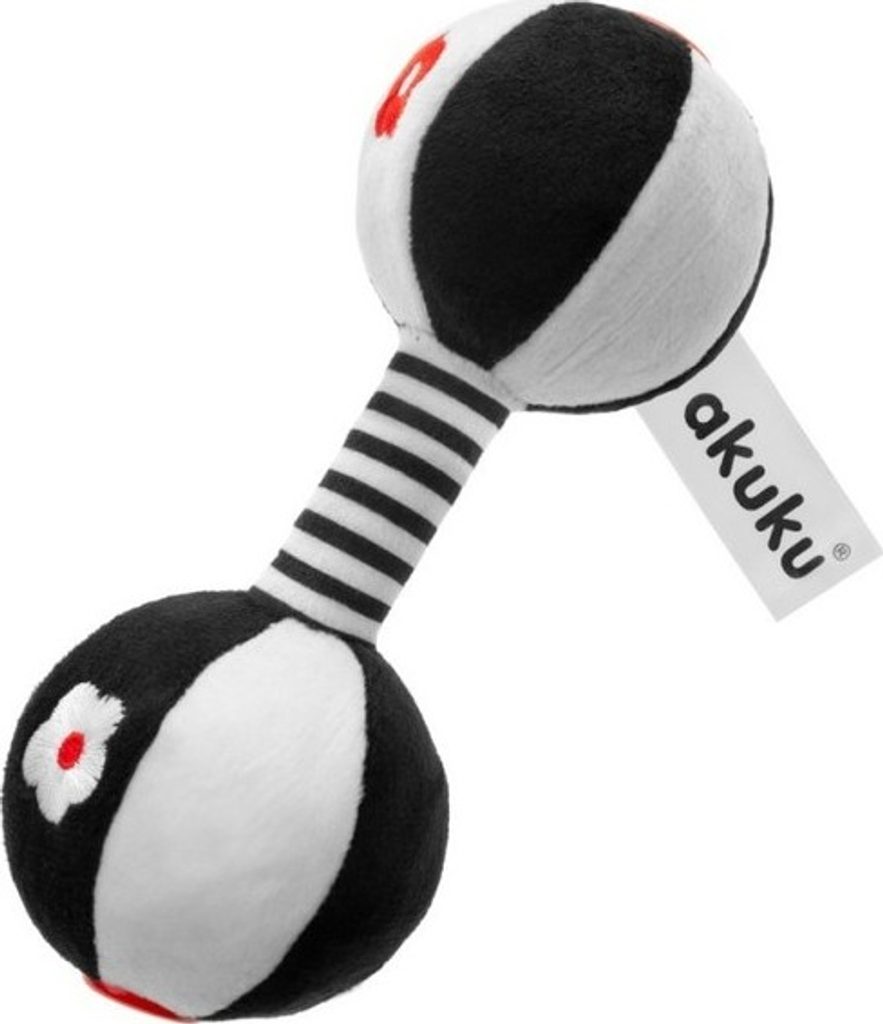 Plyšová hračka ve tvaru činky jistě potěší každé batole. Je vyrobena z příjemné plyšové látky, která nedráždí jemnou pokožku. Podporuje vývoj miminka již od prvních dnů. Hračka stimuluje zrak díky speciálně použitým barvám, které miminko vidí od narození. Činka trénuje motorické a manuální dovednosti.