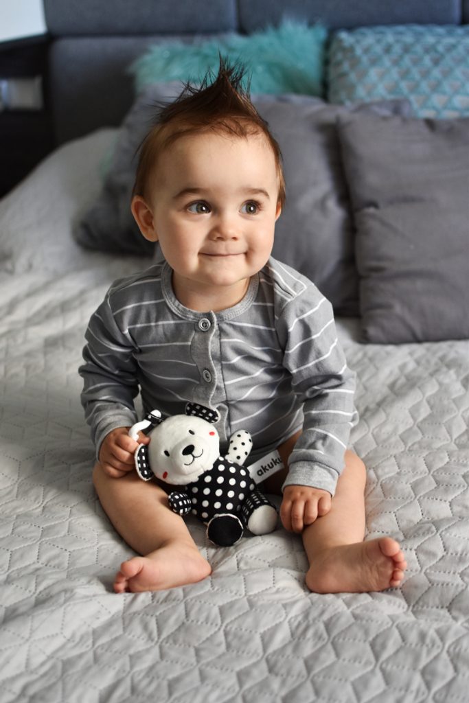 Plyšový přívěsek Medvídek bezpochyby upoutá pozornost vašeho dítěte. Maskot je vybaven univerzálním, snadno připevnitelným plastovým úchytem-háčkem, takže jej lze připevnit kdekoli doma i na cestách. Černobílé barvy stimulují zrak dítěte, které ještě nerozlišuje barvy. Výrobek je vyroben z jemného materiálu, který zabraňuje tomu, aby se s nimi dítě rozloučilo. Rozvíjí zrakovou, sluchovou a motorickou koordinaci batolete.