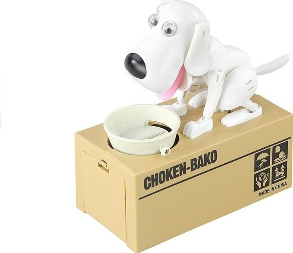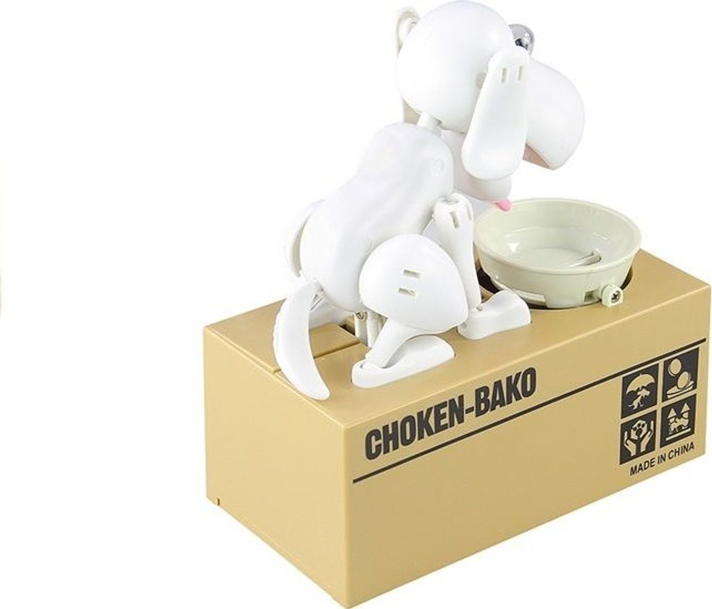 Tato úžasná kasička se skládá z velké krabice, která je schránkou na dětské peníze, pohyblivé misky s přihrádkou na mince a energického psa, který pohybuje očima, ušima, jazykem a ocasem a přitom vydává zvuky. Béžovou krabičku zdobí nápis Choken-Bako a čtyři obrázky, pejsek sedící na jejím víku má světle růžový jazyk, černý nos a krásnou bílou srst .